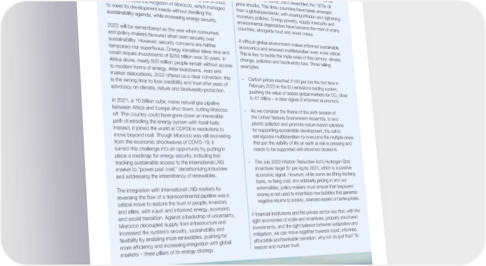 GUEST PERSPECTIVE How Morocco stays the course on a just transition towards sustainable development By Leila Benali, Minister of Energy Transition and Sustainable Development of Morocco; President, United Nations Environment Assembly A nation loses critical energy supplies and looks for In Europe, commodity and utility bills soared to record alternatives, balancing its near-term needs against longer- levels. Countries scrambled to acquire supplies or curtail term sustainability goals. While most think this refers to a consumption. For some, 2022 resembled the 1970s oil European country following the Russia-Ukraine war of 2022, price shocks. This time, countries have barely emerged it also describes the Kingdom of Morocco, which managed from a global pandemic, with soaring in昀氀ation and tightening to meet its development needs without derailing the monetary policies. Energy poverty, supply insecurity and sustainability agenda, while increasing energy security. environmental degradation have become the norm in many countries, alongside food and water crises. 2022 will be remembered as the year when consumers and policy-makers favoured short-term security over A dif昀椀cult global environment makes informed sustainable sustainability. However, security concerns are neither economics and renewed multilateralism even more critical. temporary nor super昀氀uous. Energy transition takes time and This is key to tackle the triple crisis of this century: climate could require investments of $250 trillion over 30 years. In change, pollution and biodiversity loss. Three telling Africa alone, nearly 600 million people remain without access examples: to modern forms of energy. After lockdowns, wars and market dislocations, 2022 offered us a clear conviction: this – Carbon prices reached €100 per ton the 昀椀rst time in is the wrong time to lose credibility and trust after years of February 2023 in the EU emissions trading system, advocacy on climate, nature and biodiversity protection. pushing the value of traded global markets for CO close 2 to €1 trillion – a clear signal of informed economics. In 2021, a 10 billion cubic metre natural gas pipeline between Africa and Europe shut down, cutting Morocco – As we consider the theme of the sixth session of off. The country could have gone down an irreversible the United Nations Environment Assembly, to end path of retooling the energy system with fossil fuels. plastic pollution and promote nature-based solutions Instead, it joined the world at COP26 in resolutions to for supporting sustainable development, the call to move beyond coal. Though Morocco was still recovering reinvigorate multilateralism to overcome the multiple crises from the economic shockwaves of COVID-19, it that put the viability of life on earth at risk is pressing and turned this challenge into an opportunity by putting in needs to be supported with informed decisions. place a roadmap for energy security, including fast- tracking sustainable access to the international LNG – The July 2022 In昀氀ation Reduction Act’s Hydrogen Shot market to “power past coal,” decarbonizing industries incentives target $1 per kg by 2031, which is a positive and addressing the intermittency of renewables. economic signal. However, while some are lifting fracking bans, re-昀椀ring coal, and arbitrarily pricing in and out The integration with international LNG markets by externalities, policy-makers must ensure that taxpayers’ reversing the 昀氀ow of a transcontinental pipeline was a money is not used to incentivize new bubbles that generate critical move to restore the trust of people, investors negative returns to society, stranded assets or bankruptcies. and allies, with a just and informed energy, economic and social transition. Against a backdrop of uncertainty, If 昀椀nancial institutions and the private sector say that, with the Morocco decoupled supply from infrastructure and right economies of scale and incentives, properly structured increased the system’s security, sustainability and investments, and the right balance between adaptation and 昀氀exibility by enabling more renewables, pushing for mitigation, we can move together towards a just, informed, more ef昀椀ciency and increasing integration with global affordable and bankable transition, why not do just that? To markets – three pillars of its energy strategy. restore and nurture trust. Fostering Effective Energy Transition: 2023 Edition 29