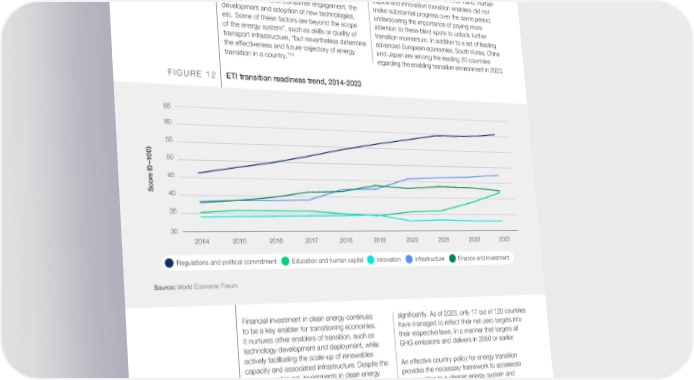 4.2 Transition readiness Only six As mentioned in Fostering Effective Energy Similar to the progress achieved on global system countries managed Transition 2020 Edition, “the energy system’s performance imperatives, transition readiness to direct more than ability to deliver on the imperatives … depends on enablers sustained a growing global average 1% of their GDP the presence of an enabling environment for the performance over the past 10 years (Figure 12). in 2022 towards energy transition, measured in the ETI framework The direct enablers have been fuelling countries’ investments in by the transition readiness sub-index. Energy transition readiness and showcase the effect of renewables. transition readiness is captured by the stability of recent global focus on the policy and investment the policy environment and the level of political transition choke points. On the other hand, human commitment, the investment climate and access capital and innovation transition enablers did not to capital, the level of consumer engagement, the make substantial progress over the same period, development and adoption of new technologies, underscoring the importance of paying more etc. Some of these factors are beyond the scope attention to these blind spots to unlock further of the energy system”, such as skills or quality of transition momentum. In addition to a set of leading transport infrastructure, “but nevertheless determine advanced European economies, South Korea, China the effectiveness and future trajectory of energy and Japan are among the leading 20 countries 21 transition in a country.” regarding the enabling transition environment in 2023. FIGURE 12 ETI transition readiness trend, 2014-2023 65 60 55 ) 00 50 1 – (0 e 45 Scor 40 35 30 2014 2015 2016 2017 2018 2019 2020 2021 2022 2023 Regulations and political commitment Education and human capital Innovation Infrastructure Finance and investment Source: World Economic Forum Financial investment in clean energy continues signi昀椀cantly. As of 2023, only 17 out of 120 countries to be a key enabler for transitioning economies. have managed to re昀氀ect their net-zero targets into It nurtures other enablers of transition, such as their respective laws, in a manner that targets all technology development and deployment, while GHG emissions and delivers in 2050 or earlier. actively facilitating the scale-up of renewables capacity and associated infrastructure. Despite the An effective country policy for energy transition progress achieved, investments in clean energy provides the necessary framework to accelerate supply remain a challenge. Only six countries the transition to a cleaner energy system and managed to direct more than 1% of their GDP in address the associated challenges of equity and 2022 towards investments in renewables. China security. While most countries have a strong had the largest share of GDP investments, investing enabling policy environment regarding energy more than 1.5% of GDP in renewables, followed by access, that environment is not as strong for Viet Nam, Azerbaijan, and Bosnia and Herzegovina. policies that enable scaling of renewable capacity or inducing energy ef昀椀ciency. Aside from a set Country commitments to their transition targets of leading advanced European economies, that were set as part of the Paris Agreement have South Korea, India, Mexico and Hungary have been translating into transition strategies. The level recently exhibited a strong enabling regulatory of granularity and maturity of these strategies varies environment to accelerate a balanced transition. Fostering Effective Energy Transition: 2023 Edition 30