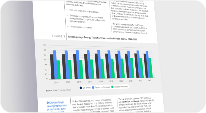 3.1 Transition scores All countries ranked in the top 10 are from Western – Increased share of clean energy in the fuel mix and Northern Europe, and account for 2% of energy-related CO2 emissions, 4% of total energy – A carbon pricing scheme supply and 2% of the global population. Sweden leads the global rankings, followed by Denmark – A strong and supportive regulatory environment and Norway. Among the world’s 10 largest to drive the energy transition economies, only France features in the top 10. The list of top performers in the ETI has remained High-ranking countries also show high scores broadly unchanged over the course of the past on transition readiness because of their strong decade. Although each country’s energy transition institutional and regulatory frameworks, their ability pathway is different, they all share common to attract capital and investment on a large scale, attributes, including: their innovative business environment and their high level of political commitment on energy transition. – Reduced levels of energy subsidies Both China and Brazil feature in the top 20, a result of their performance thus far and readiness to – Enhanced energy security from a diverse continue to transition. energy and electricity mix, as well as a mix of import partners The global average scores for the ETI have increased successively each year from 2014 to – Improved carbon intensity 2023, the result of gains across both system performance and transition readiness (Figure 4). FIGURE 4 Global average Energy Transition Index and sub-index scores, 2014-2023 70 60 50 40 30 20 10 0 2014 2015 2016 2017 2018 2019 2020 2021 2022 2023 Source: World Economic Forum ETI overall System performance Transition readiness Certain large Of the 120 countries, 113 have made progress The top improvers between 2022 and 2023 emerging centres over the last decade but only 55 have improved are Azerbaijan and Kenya. Kenya has typically of demand, such their scores by more than 10 percentage points. progressed behind the global average while as China, India Notably, large emerging centres of demand, such Azerbaijan has been ahead of it. Both have and Indonesia, as China, India and Indonesia, have seen these shown large improvements across several have improved improvements. Only 41 countries have made steady transition readiness parameters, including their scores by gains over the last decade (de昀椀ned as consistently 昀椀nancial investment, infrastructure and innovation. more than 10 above-average performance improvements on Joining them among the top improvers is percentage points. the ETI). While this list includes many advanced Paraguay, which has made progress every year economies, it also has 14 countries from developing for a decade, and Zimbabwe, whose score and emerging Europe, developing and emerging grew by 9% but continues to lag the global Asia, and Latin America and the Caribbean. Qatar average. Importantly, as countries advance, and Mexico narrowly miss falling into the category; they should achieve a balanced energy system, they made steady gains until 2023 when their but only 18% of them have achieved this progress fell below the average. These insights balance, leaving those without it vulnerable demonstrate the dif昀椀culty of maintaining progress to risks related to energy security, inequality and the energy transition’s inherent complexity. and the consequences of climate change. Fostering Effective Energy Transition: 2023 Edition 13