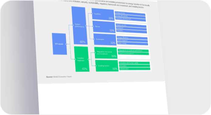Appendices A1 Methodology FIGURE 14 Methodology The ETI framework analyses countries’ current energy system performance and enabling environment for energy transition in 昀椀ve equally weighted components: equity and inclusion, security, sustainability, regulatory framework and investment, and enabling factors. Energy access Equitable Energy affordability 33% Economic development Supply security System Secure Resilience performance 33% Reliability Energy efficiency Sustainable GHG mitigation 60% 33% Clean energy ETI score Regulations and political commitment Regulatory framework Finance and investment and investment 50% Transition readiness Education and human capital Enabling factors Innovation 40% 50% Infrastructure Source: World Economic Forum Fostering Effective Energy Transition: 2023 Edition 61