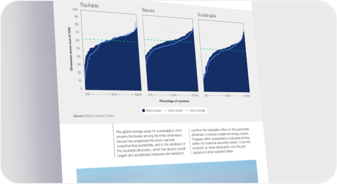 4.1 System performance To achieve an effective energy transition, countries an indication of their strong energy system growth. must balance their energy system across the Global average system performance scores have equitable, secure and sustainable dimensions, steadily increased from 59.5 to 63.0. Improvement and make progress on all (Figure 7). In the last patterns differ across dimensions however, as decade, 83% of the countries tracked by the ETI countries face competing priorities, economic have improved their energy system performance, uncertainties and geopolitical challenges. FIGURE 7 System performance dimension scores, 2014 and 2023 Equitable Secure Sustainable 100 90 80 70 60 e (out of 100)50 40 30 Dimension scor20 10 0 0% 50% 100% 0% 50% 100% 0% 50% 100% Percentage of countries 2023 scores 2014 scores 2023 average Source: World Economic Forum The global average score for sustainable in 2023 continue the noticeable effect on the sustainable remains the lowest among the three dimensions. dimension to ensure a balanced energy system. Secure has progressed the most, narrowly Progress within sustainable is noticeably lacking outperforming sustainable, and to the detriment of within the fossil fuel-exporting nations. Countries’ the equitable dimension, which has slowed overall. evolution on these dimensions over the past Urgent and accelerated measures are needed to decade is further explored below. Fostering Effective Energy Transition: 2023 Edition 20