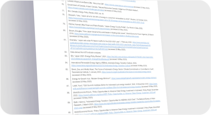 70. World Population Review, “Largest Countries in the World 2023”, 2023, https://worldpopulationreview.com/country-rankings/largest-countries-in-the-world (accessed 18 May 2023). 71. Government of Canada, Natural Resources Canada, “Remote Communities Energy Database”, https://open.canada.ca/data/en/dataset/0e76433c-7aeb-46dc-a019-11db10ee28dd (accessed 24 May 2023). 72. IEA, Canada: Energy Policy Review 2022, 2022, https://iea.blob.core.windows.net/assets/7ec2467c-78b4-4c0c-a966- a42b8861ec5a/Canada2022.pdf (accessed 25 May 2023). 73. Williams, Nia, “Canada, industry in talks to cement future carbon price hikes”, Reuters, 12 May 2022, https://www.reuters.com/business/sustainable-business/canada-industry-talks-cement-future-carbon-price-hikes-2022- 05-12/#:~:text=Canada%27s%20carbon%20price%20is%20set%20to%20rise%20to,levels%20by%202030%20and%20 reach%20net-zero%20by%202050 (accessed 25 May 2023). 74. Government of Canada, “What Is the Low Carbon Economy Fund?”, 17 October 2022, https://www.canada.ca/en/ environment-climate-change/services/climate-change/low-carbon-economy-fund/what-is-lcef.html (accessed 25 May 2023). 75. Canada Infrastructure Bank (CIB), “About the CIB”, https://cib-bic.ca/en/about-us/our-purpose (accessed 25 May 2023). 76. Government of Canada, Impact Canada, “Natural Resources Canada: Indigenous Off-diesel Initiative”, https://impact.canada.ca/en/challenges/off-diesel (accessed 25 May 2023). 77. IEA, Canada: Energy Policy Review 2022, op. cit. 78. Obayashi, Yuka, “Japan aims for 36-38% of energy to come from renewables by 2030”, Reuters, 22 October 2021, https://www.reuters.com/business/energy/japan-aims-36-38-energy-come-renewables-by-2030-2021-10-22 (accessed 25 May 2023). 79. Ritchie, Hannah, Max Roser and Pablo Rosado, “Japan: Energy Country Pro昀椀le”, Our World in Data, 2022, https://ourworldindata.org/energy/country/japan#citation (accessed 25 May 2023). 80. Broom, Douglas, “How Japan became the world leader in 昀氀oating solar power”, World Economic Forum Agenda, 22 March 2019, https://www.weforum.org/agenda/2019/03/japan-is-the-world-leader-in-昀氀oating-solar-power (accessed 25 May 2023). 81. Enerdata, “Japan sets solar PV feed-in tariffs for the 2020-2021 year”, 7 February 2020, https://www.enerdata.net/ publications/daily-energy-news/japan-sets-solar-pv-feed-tariffs-2020-2021-year.html#:~:text=The%20Japanese%20 Ministry%20of%20Economy%2C%20Trade%20and%20Industry,below%2010%20kW%20is%20set%20at%20 JPY21%2FkWh%20%28US%2419c%2FkWh%29 (accessed 25 May 2023). 82. Data derived from ETI indicator analyses. 83. IEA, “Japan 2021: Energy Policy Review”, 2021, https://iea.blob.core.windows.net/assets/3470b395-cfdd-44a9-9184- 0537cf069c3d/Japan2021_EnergyPolicyReview.pdf (accessed 18 May 2023). 84. International Renewable Energy Agency (IRENA), Indonesia Energy Transition Outlook, 2022, https://www.irena.org/publications/2022/Oct/Indonesia-Energy-Transition-Outlook (accessed 18 May 2023). 85. Brent, Zoe, and Alha昀椀z Atsari, The Future of Indonesia’s Energy Sector: Climate Commitments or Committed to Coal?, Transnational Institute, 5 January 2023, https://www.tni.org/en/publication/the-future-of-indonesias-energy-sector (accessed 25 May 2023). 86. Energy for Growth Hub, “Modern Energy Minimum”, https://www.energyforgrowth.org/projects/modern-energy-minimum (accessed 25 May 2023). 87. Latief, Yusuf, “G20 Summit mobilises $20bn for Indonesia’s just energy transition”, Enlit, 18 November 2022, https://www. enlit.world/昀椀nance-investment/g20-summit-mobilises-20bn-for-indonesias-just-energy-transition (accessed 18 May 2023). 88. World Economic Forum, “Policy Opportunities to Advance Clean Energy Investment in Indonesia”, Policy Paper, November 2022, https://www3.weforum.org/docs/WEF_Policy_Opportunities_to_Advance_Clean_Energy_Investment_2022.pdf (accessed 18 May 2023). 89. Batih, Hakimul, “Indonesia’s Energy Transition: Opportunities for ASEAN’s 2023 Chair”, The National Bureau of Asian Research, 2 March 2023, https://www.nbr.org/publication/indonesias-energy-transition-leadership-opportunities-for-aseans- 2023-chair (accessed 25 May 2023). 90. World Economic Forum, “Policy Opportunities to Advance Clean Energy Investment in Indonesia”, Policy Paper, November 2022 https://www3.weforum.org/docs/WEF_Policy_Opportunities_to_Advance_Clean_Energy_Investment_2022.pdf (accessed 25 May 2023). 91. KAPSARC, “KAPSARC Investigates Ways to Diversify Non-oil Exports to Achieve Saudi Vision 2030”, 12 October 2021, https://www.kapsarc.org/news/kapsarc-investigates-ways-to-diversify-non-oil-exports-to-achieve-saudi-vision-2030 (accessed 18 May 2023). 92. Ibid. 93. Nakano, Jane, “Saudi Arabia’s Hydrogen Industrial Strategy”, Center for Strategic & International Studies, 7 January 2022, https://www.csis.org/analysis/saudi-arabias-hydrogen-industrial-strategy?amp (accessed 18 May 2023). 94. Saudi Green Initiative, “SGI Initiatives”, https://www.greeninitiatives.gov.sa/sgi-initiatives (accessed 18 May 2023). Fostering Effective Energy Transition: 2023 Edition 69