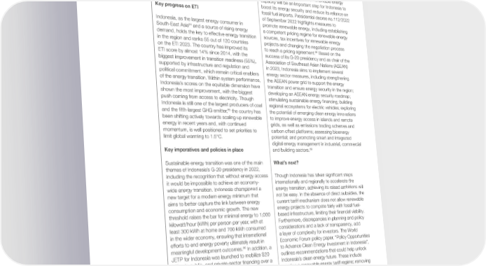 Stated energy transition goals Energy policy priorities Reduce emissions by 31.9% Peak emissions at 290 metric tonnes Retire coal-昀椀red power plants (unconditional) and 43.2% (conditional) CO2 and renewable energy share of early and restrict the development by 2030 compared to business as usual power generation at 34% by 2030 of captive coal-昀椀red plants Achieve net-zero emissions by 2060 Deploy energy ef昀椀ciency measures Develop local industry in or sooner and electri昀椀cation tools, technologies renewable energy and energy and reforms ef昀椀ciency Quickening the deployment of renewable energy Country analysis capacity will be an important step for Indonesia to boost its energy security and reduce its reliance on Key progress on ETI fossil fuel imports. Presidential decree no.112/2022 of September 2022 highlights measures to Indonesia, as the largest energy consumer in promote renewable energy, including establishing 84 and a source of rising energy South-East Asia a competent pricing regime for renewable energy demand, holds the key to effective energy transition sources, tax incentives for renewable energy in the region and ranks 55 out of 120 countries projects and changing the negotiation process 88 on the ETI 2023. The country has improved its to reach a pricing agreement. Based on the ETI score by almost 14% since 2014, with the success of its G-20 presidency and as chair of the biggest improvement in transition readiness (55%), Association of Southeast Asian Nations (ASEAN) supported by infrastructure and regulation and in 2023, Indonesia aims to implement several political commitment, which remain critical enablers energy sector measures, including strengthening of the energy transition. Within system performance, the ASEAN power grid to support the energy Indonesia’s scores on the equitable dimension have transition and ensure energy security in the region; shown the most improvement, with the biggest developing an ASEAN energy security roadmap; push coming from access to electricity. Though stimulating sustainable energy 昀椀nancing; building Indonesia is still one of the largest producers of coal regional ecosystems for electric vehicles; exploring 85 the country has the potential of emerging clean energy innovations and the 昀椀fth-largest GHG emitter, been shifting actively towards scaling up renewable to improve energy access in islands and remote energy in recent years and, with continued grids, as well as emissions trading schemes and momentum, is well positioned to set priorities to carbon offset platforms; assessing bioenergy limit global warming to 1.5°C. potential; and promoting smart and integrated digital energy management in industrial, commercial Key imperatives and policies in place 89 and building sectors. Sustainable energy transition was one of the main What’s next? themes of Indonesia’s G-20 presidency in 2022, including the recognition that without energy access Though Indonesia has taken signi昀椀cant steps it would be impossible to achieve an economy- internationally and regionally to accelerate the wide energy transition. Indonesia championed a energy transition, achieving its raised ambitions will new target for a modern energy minimum that not be easy. In the absence of direct subsidies, the aims to better capture the link between energy current tariff mechanism does not allow renewable consumption and economic growth. The new energy projects to compete fairly with fossil fuel- threshold raises the bar for minimal energy to 1,000 based infrastructure, limiting their 昀椀nancial viability. kilowatt/hour (kWh) per person per year, with at Furthermore, discrepancies in planning and policy least 300 kWh at home and 700 kWh consumed considerations and a lack of transparency, add in the wider economy, ensuring that international a layer of complexity for investors. The World efforts to end energy poverty ultimately result in Economic Forum policy paper, “Policy Opportunities 86 In addition, a to Advance Clean Energy Investment in Indonesia”, meaningful development outcomes. JETP for Indonesia was launched to mobilize $20 outlines recommendations that could help unlock billion in public- and private-sector 昀椀nancing over a Indonesia’s clean energy future. These include three- to 昀椀ve-year period to facilitate the country’s creating a renewable energy tariff regime; removing transition from coal to renewable energy, reduce regulatory barriers and implementing stable power-sector emissions and achieve net zero by frameworks to facilitate the uptake of corporate 2050. It lays out a strategy for the country based on renewable electricity sourcing; working with utilities the expansion of renewables in the energy mix (34% or electricity suppliers to accelerate the growth by 2030), the reduction of on- and off-grid coal-昀椀red of renewable energy infrastructure; implementing electricity generation, and additional commitments legislative and incentive mechanisms; and to regulatory reforms and energy ef昀椀ciency while enhancing the transparency, sustainability and implementing tangible actions to attain an equitable additionality of renewable energy certi昀椀cates to 87 90 energy transition for workers and communities. 昀椀nance new renewable energy capacity. Fostering Effective Energy Transition: 2023 Edition 50