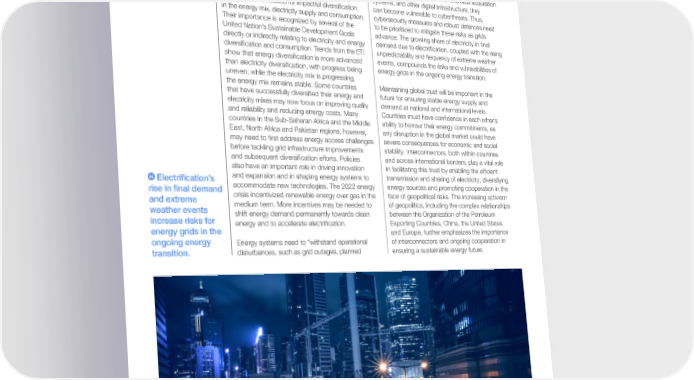 Diversi昀椀cation is critical for a secure and economic maintenance, extreme weather events or 昀椀nancial energy system as it reduces dependency, enhances shocks (e.g. price volatility). Stability enhancements resilience, manages economic risks, fosters innovation which strengthen the reliability and resilience of the and competitiveness, and supports sustainability system have never been more important or more goals. Countries with energy security challenges 12 Force majeure events, including challenging”. 13 14 have typically failed to diversify either their domestic cold snaps in New York, heatwaves in Japan, 15 energy mix or their energy import partners, or both; and earthquakes in Turkey and Syria, have shown some of the results have been seen in recent months countries that grid operations need to be able to in Europe. The ETI shows that out of 29 advanced recover quickly in the event of tail-risk scenarios. economies, eight have fuel import dependency on just As energy systems become more interconnected three trade partners for over 70% of their net energy and reliant on advanced technologies, such as imports. Seven of these eight countries are in Europe. smart grids, supervisory control and data acquisition systems, and other digital infrastructure, they Three levels are needed for impactful diversi昀椀cation: can become vulnerable to cyberthreats. Thus, in the energy mix, electricity supply and consumption. cybersecurity measures and robust defences need Their importance is recognized by several of the to be prioritized to mitigate these risks as grids United Nation’s Sustainable Development Goals advance. The growing share of electricity in 昀椀nal directly or indirectly relating to electricity and energy demand due to electri昀椀cation, coupled with the rising diversi昀椀cation and consumption. Trends from the ETI unpredictability and frequency of extreme weather show that energy diversi昀椀cation is more advanced events, compounds the risks and vulnerabilities of than electricity diversi昀椀cation, with progress being energy grids in the ongoing energy transition. uneven; while the electricity mix is progressing, the energy mix remains stable. Some countries Maintaining global trust will be important in the that have successfully diversi昀椀ed their energy and future for ensuring stable energy supply and electricity mixes may now focus on improving quality demand at national and international levels. and reliability and reducing energy costs. Many Countries must have con昀椀dence in each other’s countries in the Sub-Saharan Africa and the Middle ability to honour their energy commitments, as East, North Africa and Pakistan regions, however, any disruption in the global market could have may need to 昀椀rst address energy access challenges severe consequences for economic and social before tackling grid infrastructure improvements stability. Interconnectors, both within countries and subsequent diversi昀椀cation efforts. Policies and across international borders, play a vital role also have an important role in driving innovation in facilitating this trust by enabling the ef昀椀cient Electri昀椀cation’s and expansion and in shaping energy systems to transmission and sharing of electricity, diversifying rise in 昀椀nal demand accommodate new technologies. The 2022 energy energy sources and promoting cooperation in the and extreme crisis incentivized renewable energy over gas in the face of geopolitical risks. The increasing activism weather events medium term. More incentives may be needed to of geopolitics, including the complex relationships increase risks for shift energy demand permanently towards clean between the Organization of the Petroleum energy and to accelerate electri昀椀cation. Exporting Countries, China, the United States energy grids in the and Europe, further emphasizes the importance ongoing energy Energy systems need to “withstand operational of interconnectors and ongoing cooperation in transition. disturbances, such as grid outages, planned ensuring a sustainable energy future. Fostering Effective Energy Transition: 2023 Edition 23