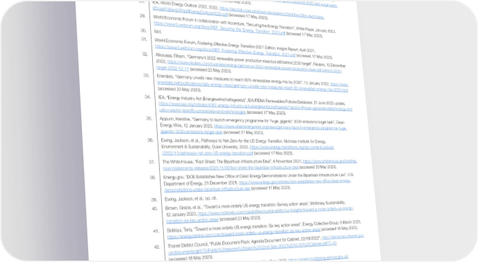23. IEA, Net Zero by 2050: A Roadmap for the Global Energy Sector, October 2021, https://iea.blob.core.windows.net/assets/ deebef5d-0c34-4539-9d0c-10b13d840027/NetZeroby2050-ARoadmapfortheGlobalEnergySector_CORR.pdf (accessed 25 May 2023). 24. Global Market Insights, Green Hydrogen Market Size – By Technology (Alkaline, PEM, Solid Oxide), By Source (Solar, Wind), By Application (Power Generation, Transportation, Industry Energy, Industry Feedstock, Building Heat & Power) & Forecast, 2022-2030, September 2022, https://www.gminsights.com/industry-analysis/green-hydrogen-market?gclid=CjwKCAiAuaKf BhBtEiwAht6H7-zUFDds4uXiKDQ19EYWBA6NmBTy4Wa--bOo2HbRVHhrFQvBvIv8MhoC7ksQAvD_BwE (accessed 25 May 2023). 25. Net Zero by 2050, op. cit. Calculated for $80/bbl. 26. Ibid. 27. Climate Bonds Initiative, “Record $269.5bn green issuance for 2020: Late surge sees pandemic year pip 2019 total by $3bn”, 24 January 2021, https://www.climatebonds.net/2021/01/record-2695bn-green-issuance-2020-late-surge-sees- pandemic-year-pip-2019-total-3bn (accessed 29 May 2023). 28. IEA, World Energy Outlook 2022, 2022, https://iea.blob.core.windows.net/assets/c282400e-00b0-4edf-9a8e- 6f2ca6536ec8/WorldEnergyOutlook2022.pdf (accessed 17 May 2023). 29. World Economic Forum in collaboration with Accenture, “Securing the Energy Transition”, White Paper, January 2023, https://www3.weforum.org/docs/WEF_Securing_the_Energy_Transition_2023.pdf (accessed 17 May 2023). 30. Ibid. 31. World Economic Forum, Fostering Effective Energy Transition 2021 Edition, Insight Report, April 2021, https://www3.weforum.org/docs/WEF_Fostering_Effective_Energy_Transition_2021.pdf (accessed 17 May 2023). 32. Alkousaa, Riham, “Germany’s 2022 renewable power production rises but still behind 2030 target”, Reuters, 12 December 2022, https://www.reuters.com/business/energy/germanys-2022-renewable-power-production-rises-still-behind-2030- target-2022-12-11 (accessed 23 May 2023). 33. Enerdata, “Germany unveils new measures to reach 80% renewables energy mix by 2030”, 12 January 2022, https://www. enerdata.net/publications/daily-energy-news/germany-unveils-new-measures-reach-80-renewables-energy-mix-2030.html (accessed 23 May 2023). 34. IEA, “Energy Industry Act (Energiewirtschaftsgesetz)”, IEA/IRENA Renewables Policies Database, 21 June 2022 update, https://www.iea.org/policies/4367-energy-industry-act-energiewirtschaftsgesetz?sector=Power+generation&technology=Ind ustry+sector-speci昀椀c+processes+and+technologies (accessed 17 May 2023). 35. Appunn, Kerstine, “Germany to launch emergency programme for ‘huge, gigantic’ 2030 emissions target task”, Clean Energy Wire, 12 January 2022, https://www.cleanenergywire.org/news/germany-launch-emergency-programme-huge- gigantic-2030-emissions-target-task (accessed 17 May 2023). 36. Ewing, Jackson, et al., Pathways to Net-Zero for the US Energy Transition, Nicholas Institute for Energy, Environment & Sustainability, Duke University, 2022, https://www.energy-transitions.org/wp-content/uploads /2022/11/pathways-net-zero-US-energy-transition.pdf (accessed 17 May 2023). 37. The White House, “Fact Sheet: The Bipartisan Infrastructure Deal”, 6 November 2021, https://www.whitehouse.gov/brie昀椀ng- room/statements-releases/2021/11/06/fact-sheet-the-bipartisan-infrastructure-deal (accessed 23 May 2023). 38. Energy.gov, “DOE Establishes New Of昀椀ce of Clean Energy Demonstrations Under the Bipartisan Infrastructure Law”, U.S. Department of Energy, 21 December 2021, https://www.energy.gov/articles/doe-establishes-new-of昀椀ce-clean-energy- demonstrations-under-bipartisan-infrastructure-law (accessed 17 May 2023). 39. Ewing, Jackson, et al., op. cit. 40. Brown, Gracie, et al., “Toward a more orderly US energy transition: Six key action areas”, McKinsey Sustainability, 12 January 2023, https://www.mckinsey.com/capabilities/sustainability/our-insights/toward-a-more-orderly-us-energy- transition-six-key-action-areas (accessed 23 May 2023). 41. Siddiqui, Tariq, “Toward a more orderly US energy transition: Six key action areas”, Energy Collective Group, 8 March 2023, https://energycentral.com/c/ec/toward-more-orderly-us-energy-transition-six-key-action-areas (accessed 18 May 2023). 42. Thanet District Council, “Public Document Pack: Agenda Document for Cabinet, 22/09/2022”, http://democracy.thanet.gov. uk/documents/g6175/Public%20reports%20pack%2022nd-Sep-2022%2019.00%20Cabinet.pdf?T=10 (accessed 18 May 2023). 43. Skidmore, Chris, Mission Zero: Independent Review of Net Zero, 2022, https://assets.publishing.service.gov.uk/ government/uploads/system/uploads/attachment_data/昀椀le/1128689/mission-zero-independent-review.pdf (accessed 24 May 2023). 44. UK Government, British Energy Security Strategy: Secure, clean and affordable British energy for the long term, April 2022, https://assets.publishing.service.gov.uk/government/uploads/system/uploads/attachment_data/昀椀le/1069969/british-energy- security-strategy-web-accessible.pdf (accessed 24 May 2023). 45. Gillespie, Todd, “UK Makes £20 Billion Bet on Carbon Capture in Race Against US”, Bloomberg, 15 March 2023, https://www.bloomberg.com/news/articles/2023-03-15/uk-makes-20-billion-bet-on-carbon-capture-in-race-against- us?leadSource=uverify%20wall (accessed 24 May 2023). Fostering Effective Energy Transition: 2023 Edition 67
