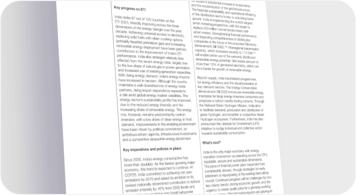 Stated energy transition goals Energy policy priorities Reduce emission intensity of GDP by Develop low-carbon electricity systems Decouple growth from 45% by 2030 from the 2005 level Develop an integrated, ef昀椀cient and emissions economy-wide Achieve net-zero emissions by 2070 inclusive low-carbon transport system Employ CO removal and 2 Achieve 50% cumulative electric power Promote adaptation in urban design, related engineering solutions installed capacity from non-fossil fuel- energy and material ef昀椀ciency in based energy resources by 2030 buildings, and sustainable urbanization will require a substantial increase in investments Country analysis and the modernization of the grid infrastructure. The 昀椀nancial sustainability and operational ef昀椀ciency Key progress on ETI of the distribution sector is key to unlocking faster growth. India is implementing the world’s largest India ranks 67 out of 120 countries on the smart metering programme, with the target to ETI 2023, steadily improving across the three replace 250 million conventional meters with dimensions of the energy triangle over the past smart meters. Strengthening 昀椀nancial performance decade. Achieving universal access to electricity, and improving competitiveness of distribution replacing solid fuels with clean cooking options companies is the focus of the proposed Electricity 116 Interregional transmission (primarily lique昀椀ed petroleum gas) and increasing (Amendment) Bill 2022. 117 renewable energy deployment have been primary capacity, which increased recently to 112 GW, contributors to the improvement of India’s ETI will enable better use of the unevenly distributed performance. India also emerged relatively less renewable energy potential. Grid losses amount to affected from the recent energy crisis, largely due more than 15% of generated electricity, which can to the low share of natural gas in power generation be a barrier for growth of renewable energy. and increased use of existing generation capacities. With rising energy demand, India’s energy imports Beyond supply, India has initiated programmes have increased in tandem. Although the country for energy ef昀椀ciency and the decarbonization of maintains a well-diversi昀椀ed mix of energy trade key demand sectors. The Energy Conservation partners, rising import dependence represents (Amendment) Bill 2022 introduces renewable energy a risk amid global energy market volatilities. The mandates for large energy-intensive consumers and energy sector’s sustainability pro昀椀le has improved, proposes a carbon credits trading scheme. Through due to the reduced energy intensity and the the National Green Hydrogen Mission, India aims increasing share of renewable energy. The energy to facilitate demand, production and distribution of mix, however, remains predominantly carbon green hydrogen, and establish a competitive Green intensive, with a low share of clean energy in 昀椀nal Hydrogen ecosystem. Furthermore, India has also demand. Improvements in the enabling environment announced the Lifestyle for Environment (LiFE) have been driven by political commitment, an initiative to nudge individual and collective action ambitious reform agenda, infrastructure investments towards sustainable consumption. and a competitive renewable energy landscape. What’s next? Key imperatives and policies in place India is the only major economy with energy Since 2000, India’s energy consumption has transition momentum accelerating across the ETI’s more than doubled. As the fastest-growing major equitable, secure and sustainable dimensions. economy, this trend is expected to continue. At The pace of thermal power plant expansion has COP26, India committed to achieving net-zero considerably slowed, though strategies for early emissions by 2070 and raised its ambition in its retirement or repurposing of the existing 昀氀eet will be revised nationally determined contribution to reduce crucial. Continued progress will be challenged by two emission intensity by 45% from 2005 levels and key macro trends: strong economic growth, and the attain 50% of cumulative non-fossil fuel power urgency to create quality jobs for a growing working- 113 generation capacity by 2030. Decarbonization of age population. Manufacturing exports are playing an power generation and electri昀椀cation of 昀椀nal demand increasing role in the economy, although the share of are key levers of India’s energy transition. low-carbon products in domestic manufacturing and exports remains low. Developing globally competitive The share of renewable energy in power generation manufacturing expertise in emerging low-carbon has steadily increased to more than 30%, with niche technologies could be a strong vehicle of solar and onshore wind accounting for 92% of future growth. A skilled workforce, public-private 114 incremental capacity in 2022. India’s commitment collaboration in innovation, and investment in research to install 500 GW of non-fossil fuel power and development in low-carbon technologies are 115 generation capacity by 2030, however, necessary to enable India’s energy transition. Fostering Effective Energy Transition: 2023 Edition 56