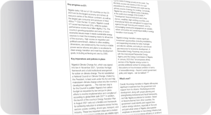 Stated energy transition goals Energy policy priorities Reduce GHG emissions by 20% Ensure 48% of the population use Achieve 30% on-grid electricity (unconditional) and 47% (conditional) by lique昀椀ed petroleum gas and 13% use from renewables, 13 GW off-grid 2030 compared to business as usual improved cookstoves by 2030 renewable energy, and reduction Reduce emissions by 50% from current Achieve 2.5% annual reduction in of grid transmission and levels by 2050 and achieve net-zero distribution losses to 8% of 昀椀nal energy intensity in all sectors energy consumption by 2030 emissions between 2050 and 2070 Achieve zero gas 昀氀aring by 2030 highest rates of energy poverty in the world. The Country analysis electricity access rate stands at 25% for rural populations for whom biomass and waste are the Key progress on ETI primary source of energy for cooking. Conversely, Nigeria has one of the highest costs of electricity Nigeria ranks 108 out of 120 countries on the ETI 127 in the world at an average of $0.52/kWh. 2023 and is the largest economy and richest oil “Development 昀椀nance institutions and other resource centre of the African continent, as well as donors, wealthier, high-emitting countries, and the largest gas consumer and producer of West international NGOs are well-placed to support this 124 Africa. Over the last 10 years, Nigeria’s overall agenda through 昀椀nancing and research, and by ETI score has improved (3%), while its system encouraging constructive engagement on subsidy performance scores have fallen slightly (1%). The reform and justice and social responsibility in energy country’s growing population and array of socio- 128 transition more broadly.” economic issues mean it needs sustainable energy sources to meet the increasing needs for all sectors Nigeria’s energy transition creates signi昀椀cant of the economy. High scores on regulation and investment opportunities, including establishing political commitment, relative to other enabling and expanding industries for solar, hydrogen dimensions, are evidenced by the country’s notable and electric vehicles, and using its vast natural power-sector reforms and plans to accelerate its gas resources for economic development. A clean energy transition and meet key development Renewable Energy Roadmap was produced goals, including achieving net zero by 2060. with the International Renewable Energy Agency and the Energy Commission of Nigeria Key imperatives and policies in place in January 2023 that “encompasses all key sectors of the Nigerian energy system to Nigeria’s Climate Change Act, which was signed provide additional context for energy policy into law in November 2021, “provides the legal discussions on how increased ambition in terms framework and a bold institutional arrangement of renewable energy – beyond current government 129 for action on climate change. The Act established policy and targets – can be realised”. a National Council on Climate Change, chaired by the President, to lead work under the Act and help What’s next? mainstream climate change action into the country’s development agenda. … The vital next step is Overall, the energy transition in Nigeria still requires for the Council to publish Nigeria’s 昀椀rst carbon signi昀椀cant investment from the government and budget as requested by law and put in place support from its citizens. Prioritizing economic efforts to monitor implementation and compliance”, development, along with proper planning and 125 according to global think tank ODI In addition, strengthening institutional and 昀椀scal frameworks, the launch of the country’s Energy Transition Plan can help Nigeria accelerate its transition. Based in August 2021 sets out a timeline and framework on lessons learned from other countries, the for achieving reduction in emissions across 昀椀ve key government could identify (and support) low- sectors: power, cooking, oil and gas, transport, and carbon energy solutions, especially in the rural industry. These two important steps and a revised and peri-urban areas of Nigeria; place greater nationally determined contribution are reliable signs emphasis on innovation in new energy infrastructure of Nigeria’s future. Nevertheless, challenges remain development; improve energy ef昀椀ciency in small and to turn these commitments into action. medium-sized enterprises; explore the effective use of domestic funding; and harmonize different energy As ODI points out, a “major obstacle to Nigeria’s policy frameworks. Together with the Renewable transition away from fossil fuels is the high levels Energy and Energy Ef昀椀ciency Associations-Alliance, of government subsidies for their production and the World Economic Forum is engaging key consumption. Progress on reforming fossil fuel public- and private-sector stakeholders to further subsidies has been challenging, as consumers understand Nigeria’s energy transition policy plans, expect accessible energy and affordable pricing associated investment barriers to accelerate the from the government as a bene昀椀t of being a major clean energy transition, and practical solutions to 126 Nigeria currently has one of the oil producer”. address those barriers. Fostering Effective Energy Transition: 2023 Edition 60