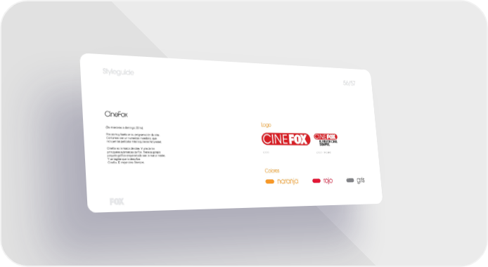 Styleguide 56/57 CineFox Logo (De miércoles a domingo, 22 hs) Fox es muy fuerte en su programación de cine. Contamos con un numeroso inventario, que EL MEJOR CINE. incluyen las películas más taquilleras Hollywood. SIEMPRE. Cinefox es la marca del cine. Y una de las principales submarcas de Fox. Tiene su propio LOGO LOGO + TAGLINE paquete gráfico emparentado con la marca madre. Y un tagline que lo describe: Cinefox. El mejor cine. Siempre. Colores naranja rojo gris