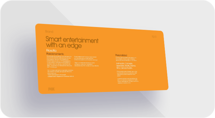 Brand 10/11 Smart entertainment dge with an e Filosofía Posicionamiento Personalidad Nos precede una reputación. La misma que dictó “Smart entertainment”, es aquello que cualquier FOX es un canal de entretenimiento general único que una serie animada podía salir en prime-time canal de cable con un puñado de shows en su categoría, Gracias a la gran variedad de (Los Simpson). Esa que hizo de fenómenos americanos puede muy bien reclamar como suyo. géneros que ofrece se asemeja a un canal de aire: paranormales un culto a la “X” (Expedientes X). La que combinó célebremente dos géneros en “Edge”, son todas esas razones que, como Animación, Comedia, apariencia disímiles, drama y comedia (Ally Mc señalamos al comienzo, le pertenecen Beal). La que trajo la primera serie en tiempo real exclusivamente a FOX. Un sello. Un toque diferente. Especiales, Reality, Drama, (24). Y la liste sigue. Films, Ciencia Ficción. Con el tiempo, Latinoamérica aprendió a reconocer ese carácter innovador, eso que para FOX es su FOX es entretenimiento inteligente, para muchos posicionamiento: tipos diferentes de personas, pero con un toque “Smart entertainment with an edge”. vanguardista que termina separándolo de lo (Entretenimiento inteligente con un enfoque distintivo). popular. La personalidad de un canal se construye largo plazo, y va más allá de la programación. Cuanto mas fácil resulta describir una marca, mas fácil es vendérsela a nuestros clientes.