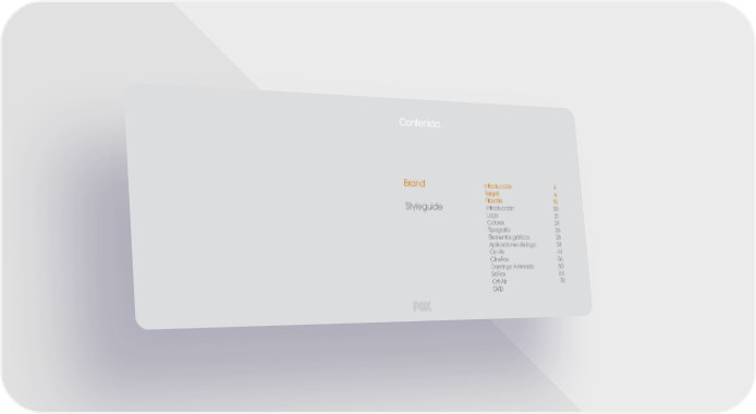 Contenido Brand Introducción 4 Target 6 Filosofía 10 Styleguide Introducción 20 Logo 21 Colores 24 Tipografffía 26 Elementos gráficos 28 Aplicaciones de logo 38 On-Air 44 CineFox 56 Domingo Animado 60 SciFox 64 Off-Air 70 DVD