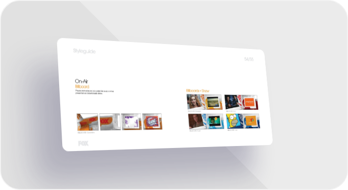 FOX Brand Book Page 28 Page 30Styleguide 54/55 On-Air Billboard Billboards + Show Piezas animadas en las cuales los auspiciantes presentan un determinado show. BILLBOARD Naranja BILLBOARD Rojo BILLBOARD Genérico BILLBOARD Cyan BILLBOARD Azul
