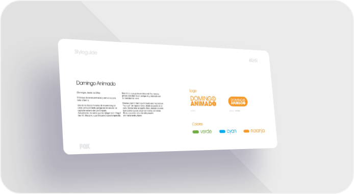Styleguide Domingo Animado Logo (Domingos, desde las 20hs) Esta franja, que ya es un clásico de Fox, tiene su ° propia identidad visual, aunque muy asociada con El bloque de series animadas y comedias para la identidad del canal. toda la familia. Desde el brand, Domingo Animado está inspirado en Una de las franjas horarias de mayor rating del “la plaza”. Un espacio verde, donde se puede ver el canal, principlamente, porque en ella se dan los cielo. Donde reina un espíritu libre y desestructurado. capítulos estreno de Los Simpson. Los colores que se utilizan son claros y brillantes. LOGO LOGO + PASTILLA Actualmente, las series que las integran son: King of Es la pieza más lúdica de este paquete the Hill, Malcolm y Los Simpson (nueva temporada). eminentemente urbano. Colores verde cyan naranja
