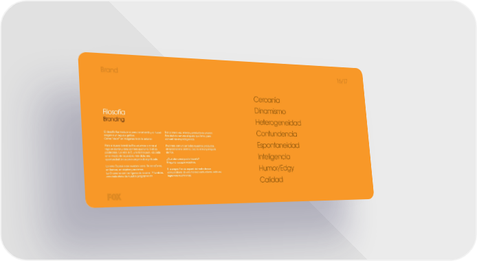 Brand 16/17 Cercanía Filosofía Dinamismo Branding Heterogeneidad El desafío fue traducir el posicionamiento y el nuevo Por primera vez, marca y producto se unieron. Contundencia slogan a un leguaje gráfico. Fox dejó de ser una etiqueta que firma, para Cómo “decir” en imágenes todo lo anterior. convertirse en protagonista. Para el nuevo brand de Fox volvimos a mirar el Pudimos comunicar todos nuestros productos, Espontaneidad logo existente y descubrimos que tenía 3 letras de una manera creativa, bajo la marca paraguas poderosas. La letra la O, una forma pura, ubicada de Fox. en el medio de la palabra, nos daba una Inteligencia oportunidad única para cargarla de significado. ¿Qué otro canal podia hacerlo? Ninguno, excepto nosotros. La letra O pasó a ser nuestro ícono. Se transforma en tramas, en objetos y acciones. Si siempre Fox se separó del resto de sus Humor/Edgy La O convive con las figuras de la canal. Y también, competidores de una manera contundente, esta vez con cada show de nuestra programación. logramos mucho más. Calidad