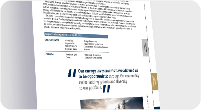 FRANCO-NEVADA CORPORATION 117 THE GOLD INVESTMENT THAT WORKS Our energy investments have allowed us to be opportunistic through the commodity cycles, adding growth and diversity to our portfolio. “ ” DIVERSIFIED ASSETS RESERVES AND RESOURCES ADDITIONAL INFORMATION Diversified Assets - Energy ENERGY ASSETS North America Island Gold Millmerran Red October Henty Mt Keith Duketon Yandal (Bronzewing/Julius) King Vol Bowen Basin South Kalgoorlie (Mt Martin) Flying Fox Sterling Robinson Fire Creek Bald Mountain Marigold EaglePicher Pinson Midas Goldstrike Gold Quarry South Arturo Hollister Nevada Australia Subika (Ahafo) Tasiast Sabodala Edikan MWS Perama Hill Kiziltepe Karma Sissingue Pandora Cobre Panama Falcondo Cerro San Pedro Castle Mountain Rosemont Mesquite Courageous Lake Musselwhite Hemlo New Prosperity Hardrock Detour Lake Midale Weyburn Goldfields Monument Bay Edson Timmins West Sudbury Kirkland Lake Golden Highway Canadian Malartic Nevada Stibnite Gold Cariboo SCOOP Midland Orion Dublin Gulch (Eagle) Red Mountain Delaware STACK Franco-Nevada Australia Office Franco-Nevada Head Office Franco-Nevada U.S. Office Franco-Nevada Barbados Office Kivivic 2 Marcellus Guadalupe-Palmarejo Brucejack CentroGold (Gurupi) Cerro Moro Taca Taca NuevaUnión (Relincho) San Jorge Antamina Salares Norte/ Rio Baker Valentine Lake Antapaccay Candelaria Calcatreu Stillwater Alpala Red Lake (Bateman) Milpillas Haynesville Agate Creek White Dam Condestable Séguéla Edna May Higginsville (Lake Cowan) Aphrodite Matilda (Wiluna) Agnew (Vivien) South Kalgoorlie (New Celebration/ Mt Marion Lithium) Cue Gold (Day Dawn) Agi Dagi ̆ ̆ Carol Lake Vale N. System Vale S.E. System Sossego Producing Advanced Producing (Energy) Edson Cardium Formation Cold Lake Anadarko Basin Permian Basin Midland Delaware STACK SCOOP Peace River Orion Athabasca Weyburn Williston Basin Midale Appalachian Basin Marcellus Oil Gas Geothermal Haynesville Neal Hot Springs Energy Assets Franco-Nevada has owned and invested in energy assets since inception. Our energy investments allow us to be opportunistic through the commodity cycles, adding growth and diversity to our portfolio. Energy revenue was 16% of Franco-Nevada’s overall revenue in 2021. The scale of the energy sector along with its many participants provides a diverse set of operators and a broad range of royalty opportunities. Until 2016, Franco-Nevada’s focus was primarily on the Western Canadian Sedimentary Basin. Starting in late 2016, we added exposure to the SCOOP/STACK basins in Oklahoma and the Midland/Delaware basins in Texas due to their attractive economics, favourable regulatory environment and access to market. In the last few years the energy additions to the portfolio have been in natural gas. In 2019, we added royalty assets in the Marcellus shale in Appalachia, and in late 2020 a portfolio of royalties in the Haynesville shale in East Texas. In 2021, Franco-Nevada updated the methodology used to account for undrilled inventory locations for our shale assets in the U.S. The locations are now based on third party reserve estimates for the Proved, Probable, Possible, and Contingent resource categories for currently producing formations. Relative to our prior methodology, these estimates do not include all hydrocarbon-bearing formations at depth and future well locations are typically constrained to shorter distances away from existing wells. Major Producing Assets as at April 8, 2022 UNITED STATES Marcellus Range Resources Haynesville Rockcliff Energy/Various SCOOP/STACK Continental Resources/Various Permian Basin Various CANADA Weyburn Unit Whitecap Resources Orion Strathcona Resources Orion processing facilities, Alberta