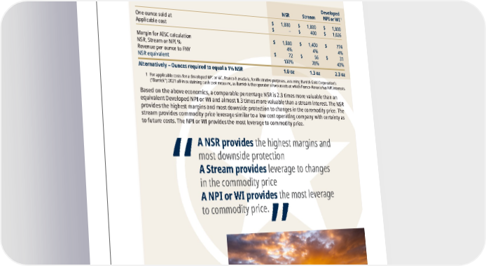 2022 ASSET HANDBOOK 34 FNV TSX NYSE OVERVIEW Royalty Ounces EXAMPLE ECONOMICS OF A ROYALTY VERSUS A STREAM The example below compares the value per ounce to Franco-Nevada of a 4% NSR, a 4% stream or a 4% NPI or WI. Assume for one ounce of gold, a sales price of $1,800, a “stream cost” of $400 per ounce and that the “all-in sustaining cost” 1 of the mine is $1,026 per ounce. Developed NSR Stream NPI or WI 1 One ounce sold at $ 1,800 $ 1,800 $ 1,800 Applicable cost $ – $ 400 $ 1,026 Margin for AISC calculation $ 1,800 $ 1,400 $ 774 NSR, Stream or NPI % 4% 4% 4% Revenue per ounce to FNV $ 72 $ 56 $ 31 NSR equivalent 100% 78% 43% Alternatively – Ounces required to equal a 1% NSR 1.0 oz 1.3 oz 2.3 oz 1 For applicable costs for a developed NPI or WI, Franco-Nevada is, for illustrative purposes, assuming Barrick Gold Corporation’s (“Barrick”) 2021 all-in sustaining cash cost measure, as Barrick is the operator of two assets at which Franco-Nevada has NPI interests. Based on the above economics, a comparable percentage NSR is 2.3 times more valuable than an equivalent Developed NPI or WI and almost 1.3 times more valuable than a stream interest. The NSR provides the highest margins and most downside protection to changes in the commodity price. The stream provides commodity price leverage similar to a low cost operating company with certainty as to future costs. The NPI or WI provides the most leverage to commodity price. A NSR provides the highest margins and most downside protection A Stream provides leverage to changes in the commodity price A NPI or WI provides the most leverage to commodity price. “ ” Duketon Mine, Australia