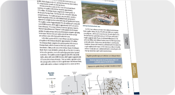 FRANCO-NEVADA CORPORATION 121 THE GOLD INVESTMENT THAT WORKS 2021 2020 2019 Revenue to Franco-Nevada ($ million) 1 $ 34.9 $ 18.5 $ 20.0 Production (Mboe) 2 708 737 524 Commodity Split (%) 3 Oil 78% 88% 88% Gas 11% 5% 4% NGL 11% 7% 8% 1 Revenue refers only to payments made to Franco-Nevada 2 Net to the Oil & Gas Interests 3 Percentage based on production revenue from each commodity 4 Inventory locations are based on third party reserve estimates for the Proved, Probable, Possible, and Contingent resource categories for currently producing formations Permian Basin Oil Texas, United States Operator: Pioneer Natural Resources, Occidental Petroleum, Coterra Energy, others Royalty : Various Royalty Rates Energy Franco-Nevada has exposure to the Permian Basin in West Texas, through both the Midland and Delaware sub-basins. Both of these basins are considered among the most economic and prolific shale oil plays in the U.S. and have been the key drivers behind U.S. oil production growth over the last decade. Effective in the first quarter of 2017, Franco-Nevada purchased a package of royalties in the Midland Basin for approximately $115 million. The Midland Basin comprises the eastern portion of the broader Permian Basin. The Permian is the most active shale play in North America. The royalty acreage is very diversified, covering a significant portion of the core of the Midland basin and providing exposure to multiple benches in the Wolfcamp and Spraberry formations. The royalties consist of approximately 97% mineral title rights, along with some GORR interests, which apply to approximately 1,012 acres (net to Franco-Nevada). The acreage is host to numerous operators, however, Pioneer Natural Resources (“Pioneer”) is the operator for the largest portion of royalty acreage and is one of the largest companies operating in the basin. Pioneer is focused solely on its Midland Basin acreage and achieves some of the best well results in the area. In the third quarter of 2017, Franco-Nevada acquired a package of royalties in the Delaware Basin for approximately $101 million. The Delaware Basin comprises the western portion of the broader Permian Basin, which is located in West Texas and southeast New Mexico. Sitting to the west of the Midland Basin, the Delaware Basin shares many similarities geologically, and has been increasing in focus for operators, due to the stacked pay potential and premier economics. The royalties consist of approximately 94% mineral title rights, along with some GORR interests, which apply to approximately 670 acres (net to Franco-Nevada). There are various operators across the acreage who continue to direct capital toward the Delaware Basin, which will result in continued development of our assets over time. Energy–U.S. Royalties provide exposure to Midland and Delaware Basins Permian represents one of the most active and economic plays in North America Exposure to upside through multiple formations at depth DIVERSIFIED ASSETS RESERVES AND RESOURCES ADDITIONAL INFORMATION REAGAN GLASSCOCK MIDLAND ECTOR UPTON CRANE HOWARD MARTIN ANDREWS BORDEN DAWSON CROCKETT IRION Midland Basin Net Royalty Acres by County Permian Basin Gross Royalty Acreage N Kilometres 0 16 Miles 0 10 Texas Midland Basin Delaware Basin New Mexico WINKLER PECOS REEVES WARD CULBERSON LOVING LEA EDDY JEFF DAVIS New Mexico Texas San Simon Channel Northwest Shelf Central Basin Platform Permian Basin Delaware Basin 23% Reeves 16% Martin 15% Glasscock 11% Midland 8% Howard 7% Loving 5% Reagan 4% Upton 3% Ward 3% Culberson 3% Eddy 1.% Lea 1% Other In 2021, Franco-Nevada generated $34.9 million from the Permian Basin royalties. During the year, 585 wells were drilled and completed on royalty lands, which is an increase from the 359 wells drilled in 2020. The land base has a potential inventory of 7,012 future well locations 4 implying approximately 12 years of additional drilling (based on the prior year drilling rate), followed by many years of additional production as the wells decline. The inventory estimate relates to currently active formations, however the Permian has additional stacked formations that may be exploited in the future. In 2021, there was a rebound of activity levels on royalty lands and combined with higher commodity prices, the Permian assets had a significant increase in revenue. Drill rig in the Permian Basin, Texas
