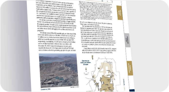 FRANCO-NEVADA CORPORATION 39 THE GOLD INVESTMENT THAT WORKS N Kilometres 0 2.5 Candelaria Gold and Silver Stream Candelaria Mining Property Area of Interest Ojos del Salado Mining Property Tierra Amarilla Santos Mine Copiapo Candelaria North (U/G) Alcaparrosa Mine Candelaria Pit Candelaria South (U/G) La Espanola PRECIOUS METALS In November 2014, Franco-Nevada (Barbados) Corporation, a subsidiary of Franco-Nevada, acquired a gold and silver stream on production from the Candelaria operation in Chile. Lundin Mining Corporation (“Lundin”) is the operator of the project and owns 80% of the asset with the balance owned by Sumitomo Corporation and its affiliates. Franco-Nevada provided an up-front deposit of $655 million to acquire the gold and silver stream from what is primarily a copper mine. The funds were used to finance a portion of the cost paid by Lundin to acquire the asset from Freeport-McMoRan Inc. Candelaria is an established mining operation and the transaction was the first material instance of a royalty/streaming company partnering with an operating company to purchase a producing asset. The stream covers the current property position of approximately 150 km 2 . An additional defined area of interest effectively doubles the property position. Should Lundin acquire properties located within the area of interest, Franco-Nevada has the option to purchase a gold and silver stream which will apply to the additional ore from such properties. The stream covers 68% of the payable gold and silver from 100% of the mine which reduces to 40% after 720,000 ounces of gold and 12 million ounces of silver have been delivered to Franco-Nevada, which are currently expected to occur in late 2026 and late 2027, respectively. Cumulatively, 427,690 ounces of gold and 6.8 million ounces of silver have been delivered since acquisition until December 31, 2021. Franco-Nevada pays an ongoing price equal to the lesser of $420.40 per ounce of gold and $4.20 per ounce of silver or the then prevailing spot price for gold and silver 2021 2020 2019 Revenue to Franco-Nevada ($ million) $ 116.5 $ 106.8 $ 103.1 P&P Reserves (koz Au) 1 2,700 2,800 2,700 M&I Resource (koz Au) 1 5,600 5,600 4,900 Inferred Resource (koz Au) 1 500 300 300 P&P Reserves (moz Ag) 1 39.0 39.0 38.0 M&I Resource (moz Ag) 1 83.0 78.0 66.0 Inferred Resource (moz Ag) 1 7.0 4.0 4.0 P&P Royalty Ounces (000s) 2 851 920 840 M&I Royalty Ounces (000s) 1, 2 1,586 1,629 1,338 Inf Royalty Ounces (000s) 2 125 75 68 1 Please refer to the tables on pages 128-136 for a breakout of grade and tonnages by Mineral Resource category; all M&I categories are inclusive of Mineral Reserves 2 For Royalty Ounce calculation, Franco-Nevada estimates P&P Royalty Ounces include payable metal of the balance of the 720,000 ounces of gold and 12 million ounces of silver remaining and the balance of P&P Reserves subject to the lower stream percentage. For M&I Royalty Ounces, Franco-Nevada has assumed the P&P Royalty Ounces with the balance of M&I Resources subject to the lower stream percentage. For Inf Royalty Ounces, Franco-Nevada assumes Inferred Mineral Resources are subject to the lower stream percentage. Silver is converted to Royalty Ounces assuming $1,800/oz gold and $23.00/oz silver ($1,750/oz gold and $25.00/oz silver in 2020, $1,400/oz gold and $18.00/oz silver in 2019). The stream interest has been factored by 77% to reflect $1,800 per ounce gold and $420.40 per ounce ongoing payments (76% in 2020, 71% in 2019) for each ounce delivered under the stream. This price escalates by 1% per annum in October of each year. The Candelaria mine was discovered in 1987 and the open pit has been in operation since 1993. The operation also includes the Candelaria North and South, Santos and Alcaparrosa underground mines. Lundin has made a significant investment in exploration at Candelaria. With the exploration success, Lundin has extended the go forward mine life from 2028, when it acquired Candelaria, to 2044. Lundin has successfully added to the Mineral Reserves and Mineral Resources at the four underground mines and has discovered the La Española open-pit deposit which is located partly on the stream concession and partly on ground covered by Franco-Nevada’s area of interest. Franco-Nevada sold 65,034 GEOs from the mine in 2021, compared with 59,655 GEOs in 2020. In 2022, Franco-Nevada expects sales from its Candelaria stream to be between 60,000 and 70,000 GEOs. DIVERSIFIED ASSETS RESERVES AND RESOURCES ADDITIONAL INFORMATION Candelaria Au & Ag Chile, South America Operator: Lundin Mining Corporation Stream: Gold and Silver Stream Precious Metals South America Updated plan extends life of mine to 2040 Successfully increased reserves and resources at four underground mines; demonstrating continued strong exploration potential Pacific Ocean ARGENTINA BOLIVIA PERU BRAZIL CHILE Candelaria Millmerran Red October Henty Mt Keith Duketon Yandal (Bronzewing/Julius) King Vol Bowen Basin South Kalgoorlie (Mt Martin) Flying Fox Australia Subika (Ahafo) Tasiast Sabodala Edikan MWS Perama Hill Kiziltepe Karma Sissingue Pandora Franco-Nevada Australia Office CentroGold (Gurupi) Cerro Moro San Jorge Antamina Salares Norte/ Rio Baker Antapaccay Candelaria Calcatreu Agate Creek White Dam Condestable Séguéla Edna May Higginsville (Lake Cowan) Aphrodite Matilda (Wiluna) Agnew (Vivien) South Kalgoorlie (New Celebration/ Mt Marion Lithium) Cue Gold (Day Dawn) Agi Dagi ̆ ̆ Producing Advanced Producing (Energy) Cascabel (Alpala) Posse (Mara Rosa) Producing Advanced Lundin Mining Corporation Candelaria, Chile