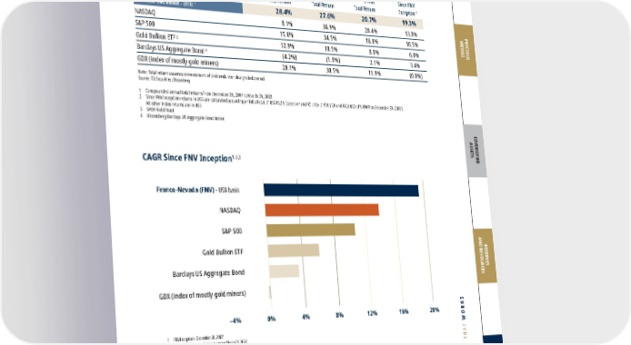 FRANCO-NEVADA CORPORATION 25 THE GOLD INVESTMENT THAT WORKS 1-Year 2-Year 5-Year Since FNV Total Return Total Return Total Return Inception 1 Franco-Nevada - (US$) 2 28.4% 27.6% 20.7% 19.3% NASDAQ 8.1% 36.9% 20.4% 13.8% S&P 500 15.6% 34.5% 16.0% 10.5% Gold Bullion ETF 3 12.9% 10.5% 8.8% 6.0% Barclays US Aggregate Bond 4 (4.2% ) (1.8% ) 2.1% 3.4% GDX (index of mostly gold miners) 20.1% 30.5% 11.9% (0.0% ) Note: Total return assumes reinvestment of dividends over designated period Source: TD Securities; Bloomberg 1 Compounded annual total returns from December 20, 2007 to March 31, 2022 2 Since FNV inception returns in US$ are calculated assuming an initial cost of US$15.21 (based on an IPO price of C$15.20 and CAD/USD of 1.0009 on December 20, 2007). All other index returns are in US$ 3 SPDR Gold Trust 4 Bloomberg Barclays US Aggregate Bond Index OVERVIEW CAGR Since FNV Inception 1,2,3 PRECIOUS METALS DIVERSIFIED ASSETS RESERVES AND RESOURCES ADDITIONAL INFORMATION TRACK RECORD Track Record Since its IPO in 2007, Franco-Nevada has out performed all the relevant benchmarks. “ ” Based on TD Securities Up to March 31, 2021 20% 24% 12% 16% 4% 8% NASDAQ S&P 500 Gold Bullion ETF Barclays US Aggregate Bond GDX (index of mostly gold miners) –4% 0% 1 FNV Inception - December 20, 2007 2 Compounded annual total returns to March 31, 2022 3 Source: TD Securities; Bloomberg Franco-Nevada (FNV) - US$ basis