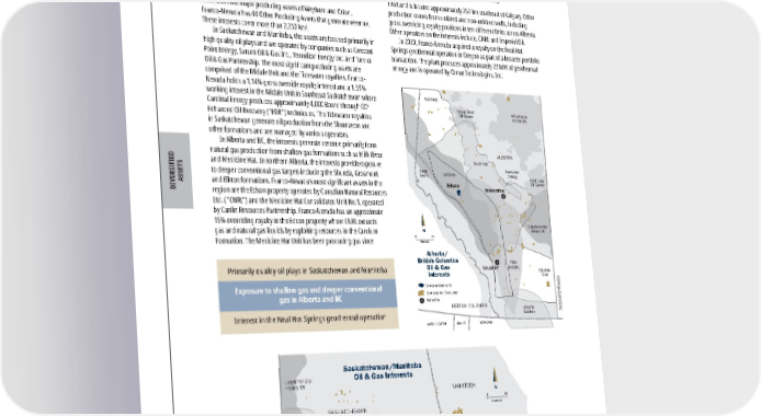 2022 ASSET HANDBOOK 124 FNV TSX NYSE Energy–Canada/U.S. Franco-Nevada has other interests in Western Canada which generate revenue primarily through lessor royalties and GORRs. Aside from the major producing assets of Weyburn and Orion, Franco-Nevada has 44 Other Producing Assets that generate revenue. These interests cover more than 2,250 km 2 . In Saskatchewan and Manitoba, the assets are focused primarily in high quality oil plays and are operated by companies such as Crescent Point Energy, Saturn Oil & Gas Inc., Vermilion Energy Inc. and Tundra Oil & Gas Partnership. The most significant producing assets are comprised of the Midale Unit and the Tidewater royalties. Franco- Nevada holds a 1.14% gross override royalty interest and a 1.59% working interest in the Midale Unit in Southeast Saskatchewan where Cardinal Energy produces approximately 4,000 Boe/d through CO 2 Enhanced Oil Recovery (“EOR”) techniques. The Tidewater royalties in Saskatchewan generate oil production from the Shaunavon and other formations and are managed by various operators. In Alberta and BC, the interests generate revenue primarily from natural gas production from shallow gas formations such as Milk River and Medicine Hat. In northern Alberta, the interests provide exposure to deeper conventional gas targets including the Shunda, Grosmont and Elkton formations. Franco-Nevada’s most significant assets in the region are the Edson property operated by Canadian Natural Resources Ltd. (“CNRL”) and the Medicine Hat Consolidated Unit No.1, operated by Canlin Resources Partnership. Franco-Nevada has an approximate 15% overriding royalty in the Edson property where CNRL extracts gas and natural gas liquids by exploiting resources in the Cardium Formation. The Medicine Hat Unit has been producing gas since 1963 and is located approximately 257 km southeast of Calgary. Other production comes from unitized and non-unitized wells, including gross overriding royalty positions in ten different Units across Alberta. Other operators on the interests include, CNRL and Imperial Oil. In 2020, Franco-Nevada acquired a royalty on the Neal Hot Springs geothermal operation in Oregon as part of a broader portfolio transaction. The plant produces approximately 22 MW of geothermal energy and is operated by Ormat Technologies, Inc. Primarily quality oil plays in Saskatchewan and Manitoba Exposure to shallow gas and deeper conventional gas in Alberta and BC Interest in the Neal Hot Springs geothermal operation DIVERSIFIED ASSETS N Kilometres 0 80 BRITISH COLUMBIA MONTANA IDAHO WASHINGTON Montney Deep Basin Edson Cardium Duvernay Alberta Bakken Lloydminster Heavy Oil Shallow Gas CBM (HSCN) Redwater Viking CALGARY Peace River Oil Sands Athabasca Oil Sands Cold Lake Oil Sands Alberta/ British Columbia Oil & Gas Interests ALBERTA EDMONTON SASKATCHEWAN Company Core Land Company Non Core Land Major City MANITOBA SASKATCHEWAN NORTH DAKOTA MONTANA Sanish Oil Torquay Oil SE Saskatchewan Lower Bakken & Mississippian Oil Williston Basin Bakken Dodsland Viking Shallow Gas Spearfish Oil REGINA Lloydminster Heavy Oil Shaunavon Oil N Kilometres 0 80 Saskatchewan/Manitoba Oil & Gas Interests Weyburn/ Midale ALBERTA Company Core Land Company Non Core Land Major City Other Producing Energy Assets BC / AB / SK / MB, Canada and Oregon, U.S. Operator: Various Royalty : ORR/FH: 0.5-20% Energy 2021 2020 2019 Revenue to Franco-Nevada ($ million) 1 $ 8.9 $ 5.1 $ 7.7 Production (Mboe) 2 257 319 323 Commodity Split (%) 3 Oil 67% 70% 79% Gas 20% 16% 10% NGL 13% 14% 11% 1 Revenue refers only to payments made to Franco-Nevada; includes revenue received from lease and bonus payments 2 Net to the Oil & Gas Interests and does not include production from Neal Hot Springs 3 Percentage based on production revenue from each commodity