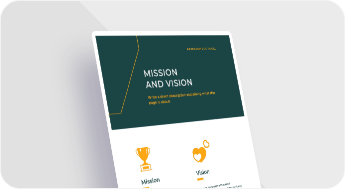 Choose from over a thousand professionally - made templates to fit any objective or topic. Make it your own by customizing it with text and photos. Mission Choose from over a thousand professionally - made templates to fit any objective or topic. Make it your own by customizing it with text and photos. Vision YOUR COMPANY NAME 04 RESEARCH PROPOSAL MISSION AND VISION Write a short description explaining what this page is about.