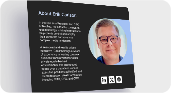 About Erik Carlson In the role as a President and CEO of Notified, he leads the company's global strategy, driving innovation to help clients control and amplify their corporate narrative in a complex media landscape. A seasoned and results-driven executive, Carlson brings a wealth of experience in leading complex business transformations within private equity-backed environments. His background spans over a decade in various executive positions at Notified and its predecessor, West Corporation, including COO, CFO, and CPO.