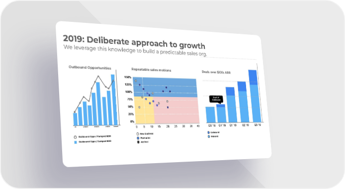 2019: Deliberate approach to growth We leverage this knowledge to build a predictable sales org. Outbound Opportunities Repeatable sales motions Deals over $XXk ARR 150% 125% 100% Start of Outbound 75% 50% 25% 0% 1/9 3/19/2019 5/19/2019 7/19/2019 9/19/2019 Q3 ‘18 Q4 ‘18 Q1 ‘19 Q2 ‘19 Q3 ‘19 0 5 10 15 20 25 30 35 40 New Business Outbound Outbound Opps / Ramped BDR Post sales Inbound Outbound Opps / Ramped BDR Attrited