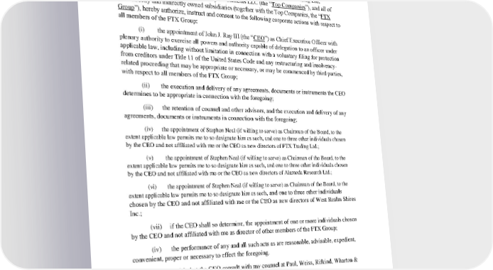 DocuSign Envelope ID: 245C6A4E-CB65-4118-9D31-D6631AE86C9A Case 22-11066 Doc 1 Filed 11/11/22 Page 12 of 23 Omnibus Corporate Authority I, Samuel Benjamin Bankman-Fried, as controlling owner, director, officer, manager or other authorized person with respect to West Realm Shires Inc., Paper Bird Inc., Hilltop Technology Services LLC, Cedar Grove Technologies Services, Ltd., FTX Trading Ltd, Alameda Research LLC and Clifton Bay Investments LLC (the “Top Companies”), and all of their directly and indirectly owned subsidiaries (together with the Top Companies, the “FTX Group”), hereby authorize, instruct and consent to the following corporate actions with respect to all members of the FTX Group: (i) the appointment of John J. Ray III (the “CEO”) as Chief Executive Officer with plenary authority to exercise all powers and authority capable of delegation to an officer under applicable law, including without limitation in connection with a voluntary filing for protection from creditors under Title 11 of the United States Code and any restructuring and insolvency- related proceeding that may be appropriate or necessary, or may be commenced by third parties, with respect to all members of the FTX Group; (ii) the execution and delivery of any agreements, documents or instruments the CEO determines to be appropriate in connection with the foregoing; (iii) the retention of counsel and other advisors, and the execution and delivery of any agreements, documents or instruments in connection with the foregoing; (iv) the appointment of Stephen Neal (if willing to serve) as Chairman of the Board, to the extent applicable law permits me to so designate him as such, and one to three other individuals chosen by the CEO and not affiliated with me or the CEO as new directors of FTX Trading Ltd.; (v) the appointment of Stephen Neal (if willing to serve) as Chairman of the Board, to the extent applicable law permits me to so designate him as such, and one to three other individuals chosen by the CEO and not affiliated with me or the CEO as new directors of Alameda Research Ltd.; (vi) the appointment of Stephen Neal (if willing to serve) as Chairman of the Board, to the extent applicable law permits me to so designate him as such, and one to three other individuals chosen by the CEO and not affiliated with me or the CEO as new directors of West Realm Shires Inc.; (vii) if the CEO shall so determine, the appointment of one or more individuals chosen by the CEO and not affiliated with me as director of other members of the FTX Group; (iv) the performance of any and all such acts as are reasonable, advisable, expedient, convenient, proper or necessary to effect the foregoing. It is my wish that the CEO consult with my counsel at Paul, Weiss, Rifkind, Wharton & Garrison LLP with respect to the foregoing director appointments. Date: November 10, 2022 ____________________________ Samuel Benjamin Bankman-Fried
