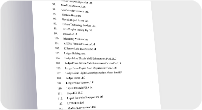 Case 22-11066 Doc 1 Filed 11/11/22 Page 10 of 23 88. FTX Ventures Ltd 89. FTX Ventures Partnership 90. FTX Zuma Ltd 91. GG Trading Terminal Ltd 92. Global Compass Dynamics Ltd. 93. Good Luck Games, LLC 94. Goodman Investments Ltd. 95. Hannam Group Inc 96. Hawaii Digital Assets Inc. 97. Hilltop Technology Services LLC 98. Hive Empire Trading Pty Ltd 99. Innovatia Ltd 100. Island Bay Ventures Inc 101. K-DNA Financial Services Ltd 102. Killarney Lake Investments Ltd 103. Ledger Holdings Inc. 104. LedgerPrime Bitcoin Yield Enhancement Fund, LLC 105. LedgerPrime Bitcoin Yield Enhancement Master Fund LP 106. LedgerPrime Digital Asset Opportunities Fund, LLC 107. LedgerPrime Digital Asset Opportunities Master Fund LP 108. Ledger Prime LLC 109. LedgerPrime Ventures, LP 110. Liquid Financial USA Inc. 111. LiquidEX LLC 112. Liquid Securities Singapore Pte Ltd 113. LT Baskets Ltd. 114. Maclaurin Investments Ltd. 115. Mangrove Cay Ltd 116. North Dimension Inc 117. North Dimension Ltd 118. North Wireless Dimension Inc