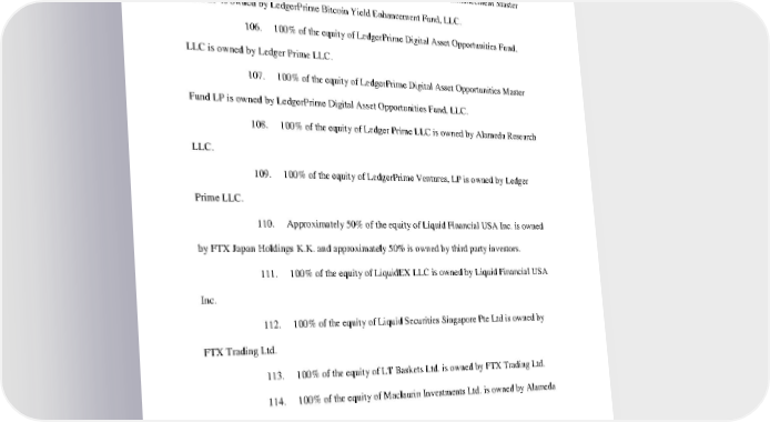 Case 22-11066 Doc 1 Filed 11/11/22 Page 21 of 23 104. 100% of the equity of LedgerPrime Bitcoin Yield Enhancement Fund, LLC is owned by Ledger Prime LLC. 105. 100% of the equity of LedgerPrime Bitcoin Yield Enhancement Master Fund LP is owned by LedgerPrime Bitcoin Yield Enhancement Fund, LLC. 106. 100% of the equity of LedgerPrime Digital Asset Opportunities Fund, LLC is owned by Ledger Prime LLC. 107. 100% of the equity of LedgerPrime Digital Asset Opportunities Master Fund LP is owned by LedgerPrime Digital Asset Opportunities Fund, LLC. 108. 100% of the equity of Ledger Prime LLC is owned by Alameda Research LLC. 109. 100% of the equity of LedgerPrime Ventures, LP is owned by Ledger Prime LLC. 110. Approximately 50% of the equity of Liquid Financial USA Inc. is owned by FTX Japan Holdings K.K. and approximately 50% is owned by third party investors. 111. 100% of the equity of LiquidEX LLC is owned by Liquid Financial USA Inc. 112. 100% of the equity of Liquid Securities Singapore Pte Ltd is owned by FTX Trading Ltd. 113. 100% of the equity of LT Baskets Ltd. is owned by FTX Trading Ltd. 114. 100% of the equity of Maclaurin Investments Ltd. is owned by Alameda Research Ltd. 115. 100% of the equity of Mangrove Cay Ltd is owned by FTX Trading Ltd. -9-