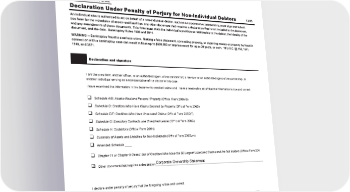 Case 22-11066 Doc 1 Filed 11/11/22 Page 6 of 23 Fill in this information to identify the case and this filing: AlamedaResearchLLC Debtor Name __________________________________________________________________ Delaware United States Bankruptcy Court for the: ______________________District of __________ (State) Case number (If known): _________________________ Official F orm 202 Declaration Under Penalty of Perjury for Non-Individual Debtors 12/15 An individual who is authorized to act on behalf of a non-individual debtor, such as a corporation or partnership, must sign and submit this form for the schedules of assets and liabilities, any other document that requires a declaration that is not included in the document, and any amendments of those documents. This form must state the individual’s position or relationship to the debtor, the identity of the document, and the date. Bankruptcy Rules 1008 and 9011. WARNING -- Bankruptcy fraud is a serious crime. Making a false statement, concealing property, or obtaining money or property by fraud in connection with a bankruptcy case can result in fines up to $500,000 or imprisonment for up to 20 years, or both. 18 U.S.C. §§ 152, 1341, 1519, and 3571. Declaration and signature I am the president, another officer, or an authorized agent of the corporation; a member or an authorized agent of the partnership; or another individual serving as a representative of the debtor in this case. I have examined the information in the documents checked below and I have a reasonable belief that the information is true and correct: ‰ Schedule A/B: Assets–Real and Personal Property (Official Form 206A/B) ‰ Schedule D: Creditors Who Have Claims Secured by Property (Official Form 206D) ‰ Schedule E/F: Creditors Who Have Unsecured Claims (Official Form 206E/F) ‰ Schedule G: Executory Contracts and Unexpired Leases (Official Form 206G) ‰ Schedule H: Codebtors (Official Form 206H) ‰ Summary of Assets and Liabilities for Non-Individuals (Official Form 206Sum) ‰ AmendedSchedule ____ ‰ Chapter11 orChapter 9 Cases: List of Creditors Who Have the Largest Unsecured Claims and Are Not Insiders (Official Form 204) ✔ Corporate Ownership Statement ‰ Other document that requires a declaration__________________________________________________________________________________ I declare under penalty of perjury that the foregoing is true and correct. 11/11/2022 /s/ John J. Ray Executed on ______________ 8_________________________________________________________________________ MM / DD / YYYY Signature of individual signing on behalf of debtor John J. Ray III ________________________________________________________________________ Printed name Chief Executive Officer ______________________________________ Position or relationship to debtor Official Form 202 Declaration Under Penalty of Perjury for Non-Individual Debtors