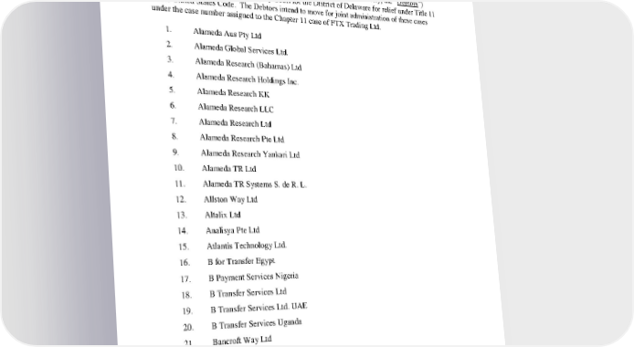 Case 22-11066 Doc 1 Filed 11/11/22 Page 7 of 23 ANNEX 1 Pending Bankruptcy Cases Filed by the Debtor and Affiliates of the Debtor On the date hereof, each of the entities listed below (collectively, the “Debtors”) filed a petition in the U.S. Bankruptcy Court for the District of Delaware for relief under Title 11 of the United States Code. The Debtors intend to move for joint administration of these cases under the case number assigned to the Chapter 11 case of FTX Trading Ltd. 1. Alameda Aus Pty Ltd 2. Alameda Global Services Ltd. 3. Alameda Research (Bahamas) Ltd 4. Alameda Research Holdings Inc. 5. Alameda Research KK 6. Alameda Research LLC 7. Alameda Research Ltd 8. Alameda Research Pte Ltd 9. Alameda Research Yankari Ltd 10. Alameda TR Ltd 11. Alameda TR Systems S. de R. L. 12. Allston Way Ltd 13. Altalix Ltd 14. Analisya Pte Ltd 15. Atlantis Technology Ltd. 16. B for Transfer Egypt 17. B Payment Services Nigeria 18. B Transfer Services Ltd 19. B Transfer Services Ltd. UAE 20. B Transfer Services Uganda 21. Bancroft Way Ltd 22. BitPesa Kenya Ltd. 23. BitPesa RDC SARL 24. BitPesa Senegal Ltd. 25. BitPesa South Africa