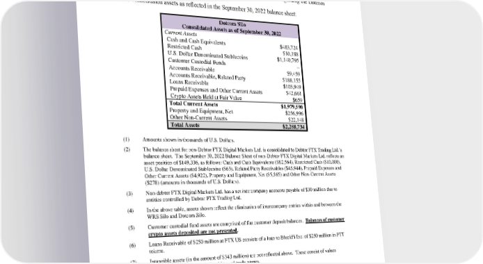Case 22-11068-JTD Doc 24 Filed 11/17/22 Page 13 of 30 produced while the Debtors were controlled by Mr. Bankman-Fried, I do not have confidence in it, and the information therein may not be correct as of the date stated. 37. The chart below summarizes certain information regarding the Dotcom Silo’s consolidated assets as reflected in the September 30, 2022 balance sheet: Dotcom Silo Consolidated Assets as of September 30, 2022 Current Assets Cash and Cash Equivalents $483,724 Restricted Cash $10,188 U.S. Dollar Denominated Stablecoins $1,140,795 Customer Custodial Funds – Accounts Receivable $9,459 Accounts Receivable, Related Party $188,155 Loans Receivable $103,949 Prepaid Expenses and Other Current Assets $42,661 Crypto Assets Held at Fair Value $659 Total Current Assets $1,979,590 Property and Equipment, Net $256,996 Other Non-Current Assets $22,148 Total Assets $2,258,734 (1) Amounts shown in thousands of U.S. Dollars. (2) The balance sheet for non-Debtor FTX Digital Markets Ltd. is consolidated to Debtor FTX Trading Ltd.’s balance sheet. The September 30, 2022 Balance Sheet of non-Debtor FTX Digital Markets Ltd. reflects an asset position of $149,336, as follows: Cash and Cash Equivalents ($82,564), Restricted Cash ($10,000), U.S. Dollar Denominated Stablecoins ($63), Related Party Receivables ($45,944), Prepaid Expenses and Other Current Assets ($4,922), Property and Equipment, Net ($5,565) and Other Non-Current Assets ($278) (amounts in thousands of U.S. Dollars). (3) Non-debtor FTX Digital Markets Ltd. has a net intercompany accounts payable of $30 million due to entities controlled by Debtor FTX Trading Ltd. (4) In the above table, assets shown reflect the elimination of intercompany entries within and between the WRS Silo and Dotcom Silo. (5) Customer custodial fund assets are comprised of fiat customer deposit balances. Balances of customer crypto assets deposited are not presented. (6) Loans Receivable of $250 million at FTX US consists of a loan to BlockFi Inc. of $250 million in FTT tokens. (7) Intangible assets (in the amount of $343 million) are not reflected above. These consist of values attributable to customer relationships and trade names. (8) Goodwill balance (in the amount of $359 million) is not reflected above. 38. To my knowledge, the Dotcom Silo Debtors do not have any long-term or funded debt. The Dotcom Silo Debtors may have significant liabilities to customers through the -13- 4892-0827-0654 v.2