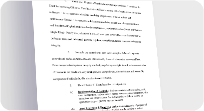 Case 22-11068-JTD Doc 24 Filed 11/17/22 Page 2 of 30 U.S. Commodity Futures Trading Commission (“CFTC”), the U.S. Attorney’s Office for the Southern District of New York, the U.S. Securities and Exchange Commission (“SEC”), and the U.S. Congress, among others. 4. I have over 40 years of legal and restructuring experience. I have been the Chief Restructuring Officer or Chief Executive Officer in several of the largest corporate failures in history. I have supervised situations involving allegations of criminal activity and malfeasance (Enron). I have supervised situations involving novel financial structures (Enron and Residential Capital) and cross-border asset recovery and maximization (Nortel and Overseas Shipholding). Nearly every situation in which I have been involved has been characterized by defects of some sort in internal controls, regulatory compliance, human resources and systems integrity. 5. Never in my career have I seen such a complete failure of corporate controls and such a complete absence of trustworthy financial information as occurred here. From compromised systems integrity and faulty regulatory oversight abroad, to the concentration of control in the hands of a very small group of inexperienced, unsophisticated and potentially compromised individuals, this situation is unprecedented. 6. These Chapter 11 Cases have five core objectives: (a) Implementation of Controls: the implementation of accounting, audit, cash management, cybersecurity, human resources, risk management, data protection and other systems that did not exist, or did not exist to an appropriate degree, prior to my appointment; (b) Asset Protection & Recovery: the location and security of property of the estate, a substantial portion of which may be missing or stolen; (c) Transparency and Investigation: the pending, comprehensive, transparent and deliberate investigation into claims against Mr. Samuel Bankman-Fried, the other co-founders of the Debtors and third parties, in -2- 4892-0827-0654 v.2