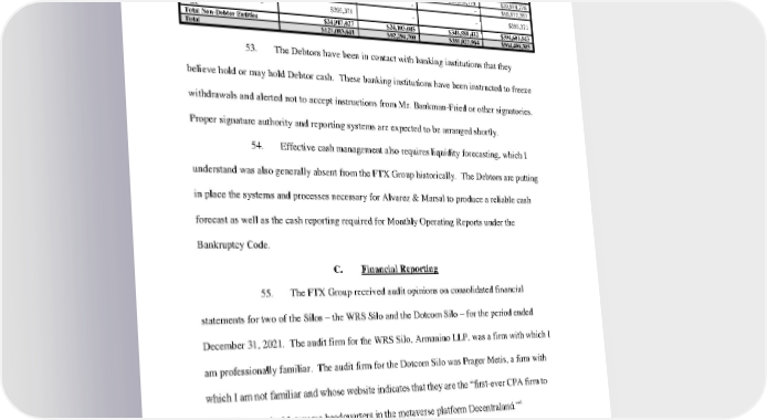 Case 22-11068-JTD Doc 24 Filed 11/17/22 Page 20 of 30 Entity Unrestricted Cash Custodial Cash Other Restricted Cash Total Cash Total Debtor Entities $96,166,614 $68,191,615 $5,446,532 $169,804,762 Non-Debtor Entities LedgerX LLC $13,644,269 $24,103,085 $265,603,056 $303,350,409 FTX Digital Markets Ltd - - $49,999,600 $49,999,600 Embed Clearing LLC. - - $29,978,776 $29,978,776 FTX Philanthropy Inc $10,877,387 - - $10,877,387 Embed Financial Technologies $395,371 - - $395,371 Inc Total Non-Debtor Entities $24,917,027 $24,103,085 $345,581,432 $394,601,543 Total $121,083,641 $92,294,700 $351,027,964 $564,406,305 53. The Debtors have been in contact with banking institutions that they believe hold or may hold Debtor cash. These banking institutions have been instructed to freeze withdrawals and alerted not to accept instructions from Mr. Bankman-Fried or other signatories. Proper signature authority and reporting systems are expected to be arranged shortly. 54. Effective cash management also requires liquidity forecasting, which I understand was also generally absent from the FTX Group historically. The Debtors are putting in place the systems and processes necessary for Alvarez & Marsal to produce a reliable cash forecast as well as the cash reporting required for Monthly Operating Reports under the Bankruptcy Code. C. Financial Reporting 55. The FTX Group received audit opinions on consolidated financial statements for two of the Silos – the WRS Silo and the Dotcom Silo – for the period ended December 31, 2021. The audit firm for the WRS Silo, Armanino LLP, was a firm with which I am professionally familiar. The audit firm for the Dotcom Silo was Prager Metis, a firm with which I am not familiar and whose website indicates that they are the “first-ever CPA firm to officially open its Metaverse headquarters in the metaverse platform Decentraland.”4 4 https://pragermetis.com/news/prager-metis-opens-first-ever-cpa-firm-metaverse/. -20- 4892-0827-0654 v.2
