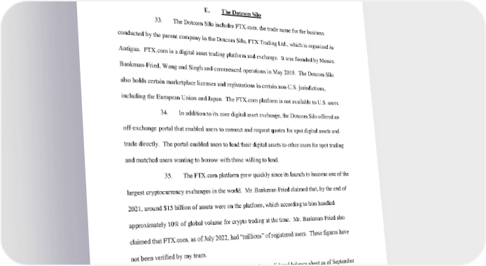 Case 22-11068-JTD Doc 24 Filed 11/17/22 Page 12 of 30 (4) Customer custodial fund liabilities are comprised of fiat customer deposit balances. Balances of customer crypto assets deposited are not presented. 32. All Debtors in the Ventures Silo are organized in the State of Delaware or the British Virgin Islands. E. The Dotcom Silo 33. The Dotcom Silo includes FTX.com, the trade name for the business conducted by the parent company in the Dotcom Silo, FTX Trading Ltd., which is organized in Antigua. FTX.com is a digital asset trading platform and exchange. It was founded by Messrs. Bankman-Fried, Wang and Singh and commenced operations in May 2019. The Dotcom Silo also holds certain marketplace licenses and registrations in certain non-U.S. jurisdictions, including the European Union and Japan. The FTX.com platform is not available to U.S. users. 34. In addition to its core digital asset exchange, the Dotcom Silo offered an off-exchange portal that enabled users to connect and request quotes for spot digital assets and trade directly. The portal enabled users to lend their digital assets to other users for spot trading and matched users wanting to borrow with those willing to lend. 35. The FTX.com platform grew quickly since its launch to become one of the largest cryptocurrency exchanges in the world. Mr. Bankman-Fried claimed that, by the end of 2021, around $15 billion of assets were on the platform, which according to him handled approximately 10% of global volume for crypto trading at the time. Mr. Bankman-Fried also claimed that FTX.com, as of July 2022, had “millions” of registered users. These figures have not been verified by my team. 36. The Dotcom Silo’s unaudited consolidated balance sheet as of September 30, 2022 is the latest balance sheet that was provided to me with respect to the Dotcom Silo. It shows total assets of $2.25 billion as of September 30, 2022. Because such balance sheet was -12- 4892-0827-0654 v.2