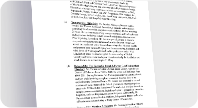 Case 22-11068-JTD Doc 24 Filed 11/17/22 Page 17 of 30 (b) Alameda Silo: Matthew R. Rosenberg: Mr. Rosenberg is a Partner at Lincoln Park Advisors, a financial advisory firm that he founded in 2014. He has more than 25 years of restructuring, corporate finance, principal investing, operating and board experience. Prior to founding Lincoln Park Advisors, he was a partner at the restructuring and investment banking firm Chilmark Partners, a partner in two private equity funds, the Zell/Chilmark Fund and Chilmark Fund II, the Chief Restructuring Officer of The Wellbridge Company and a member of multiple corporate boards. His restructuring advisory experience includes such companies as OSG, Supermedia, Nortel, Trinity Coal, USG Corporation, JHT Holdings, Inc., Covanta Energy, Sirva, Lodgian, Inc., ContiGroup Companies, Inc., Fruit of the Loom, Ltd. and Recycled Paper Greetings. (c) Ventures Silo: Rishi Jain: Mr. Jain is a Managing Director and Co- Head of the Western Region of Accordion, a financial and technology consulting firm focused on the private equity industry. He has more than 25 years of experience supporting management teams and leading finance and operations initiatives in both stressed and distressed environments. Prior to joining Accordion, Mr. Jain was part of Alvarez & Marsal’s corporate restructuring and turnaround practice for over 10 years and served in a variety of senior financial operating roles. His most notable assignments have included helping lead the restructuring, liquidation and wind down of Washington Mutual and its predecessor entity, WMI Liquidating Trust. He also navigated the restructuring of Global Geophysical Services in its chapter 11 and eventually the liquidation and wind down in its second chapter 11 filing. (d) Dotcom Silo: The Honorable Joseph J. Farnan (Lead Independent Director): Mr. Farnan served as a United States District Judge for the District of Delaware from 1985 to 2010. He served as Chief Judge from 1997-2001. During his tenure, Mr. Farnan presided over numerous bench and jury trials involving complex commercial disputes. Prior to his appointment to the federal bench, Mr. Farnan was appointed to several positions in local, state and the federal government returning to private practice in 2010 with the formation of Farnan LLP, a law firm focused on complex commercial matters, including chapter 11 proceedings, securities litigation, antitrust litigation and patent litigation. Additionally, Mr. Farnan serves as an arbitrator, mediator, independent director and trustee of businesses contemplating or filing chapter 11 bankruptcy. (e) Dotcom Silo: Matthew A. Doheny: Mr. Doheny is President of North Country Capital LLC, an advisory and investment firm focused on challenging advisory assignments and investing private investment portfolios in special situation opportunities. He has held this position since January 2011. Mr. Doheny has served on the board of directors or as Chief Restructuring Officer of numerous stressed and distressed companies, including Yellow Corp., MatlinPatterson, GMAC Rescap and Eastman -17- 4892-0827-0654 v.2