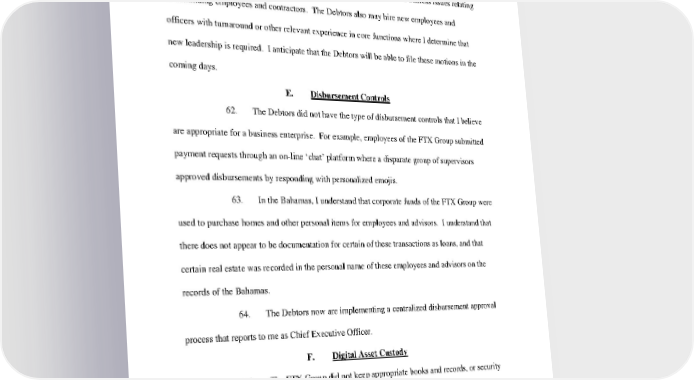 Case 22-11068-JTD Doc 24 Filed 11/17/22 Page 22 of 30 personal circumstances, have risen to the occasion and demonstrated their critical importance to the Debtors. 61. The Debtors are preparing one or more motions to address issues relating to continuing employees and contractors. The Debtors also may hire new employees and officers with turnaround or other relevant experience in core functions where I determine that new leadership is required. I anticipate that the Debtors will be able to file these motions in the coming days. E. Disbursement Controls 62. The Debtors did not have the type of disbursement controls that I believe are appropriate for a business enterprise. For example, employees of the FTX Group submitted payment requests through an on-line ‘chat’ platform where a disparate group of supervisors approved disbursements by responding with personalized emojis. 63. In the Bahamas, I understand that corporate funds of the FTX Group were used to purchase homes and other personal items for employees and advisors. I understand that there does not appear to be documentation for certain of these transactions as loans, and that certain real estate was recorded in the personal name of these employees and advisors on the records of the Bahamas. 64. The Debtors now are implementing a centralized disbursement approval process that reports to me as Chief Executive Officer. F. Digital Asset Custody 65. The FTX Group did not keep appropriate books and records, or security controls, with respect to its digital assets. Mr. Bankman-Fried and Mr. Wang controlled access to digital assets of the main businesses in the FTX Group (with the exception of LedgerX, regulated by the CFTC, and certain other regulated and/or licensed subsidiaries). Unacceptable -22- 4892-0827-0654 v.2
