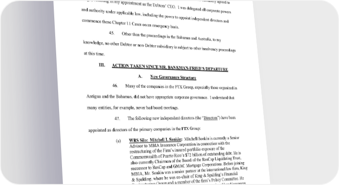 Case 22-11068-JTD Doc 24 Filed 11/17/22 Page 16 of 30 School. A document effecting a relinquishment of control was prepared and comments from Mr. Bankman-Fried’s team incorporated. At approximately 4:30 a.m. EST on Friday, November 11, 2022, after further consultation with his legal counsel, Mr. Bankman-Fried ultimately agreed to resign, resulting in my appointment as the Debtors’ CEO. I was delegated all corporate powers and authority under applicable law, including the power to appoint independent directors and commence these Chapter 11 Cases on an emergency basis. 45. Other than the proceedings in the Bahamas and Australia, to my knowledge, no other Debtor or non-Debtor subsidiary is subject to other insolvency proceedings at this time. III. ACTION TAKEN SINCE MR. BANKMAN-FRIED’S DEPARTURE A. New Governance Structure 46. Many of the companies in the FTX Group, especially those organized in Antigua and the Bahamas, did not have appropriate corporate governance. I understand that many entities, for example, never had board meetings. 47. The following new independent directors (the “Directors”) have been appointed as directors of the primary companies in the FTX Group: (a) WRS Silo: Mitchell I. Sonkin: Mitchell Sonkin is currently a Senior Advisor to MBIA Insurance Corporation in connection with the restructuring of the Firm’s insured portfolio exposure of the Commonwealth of Puerto Rico’s $72 billion of outstanding debt. He is also currently Chairman of the Board of the ResCap Liquidating Trust, successor to ResCap and GMAC Mortgage Corporations. Before joining MBIA, Mr. Sonkin was a senior partner at the international law firm, King & Spalding, where he was co-chair of King & Spalding’s Financial Restructuring Group and a member of the firm’s Policy Committee. He has over 40 years of experience in U.S. and international bond issuances, corporate reorganizations, bankruptcies and other debt restructurings and has served as a bankruptcy-court-appointed examiner. In particular, he has played a significant role in numerous municipal, utility, insurance, airline, healthcare debt and international debt restructurings including the Anglo/French Euro Tunnel debt reorganization. -16- 4892-0827-0654 v.2