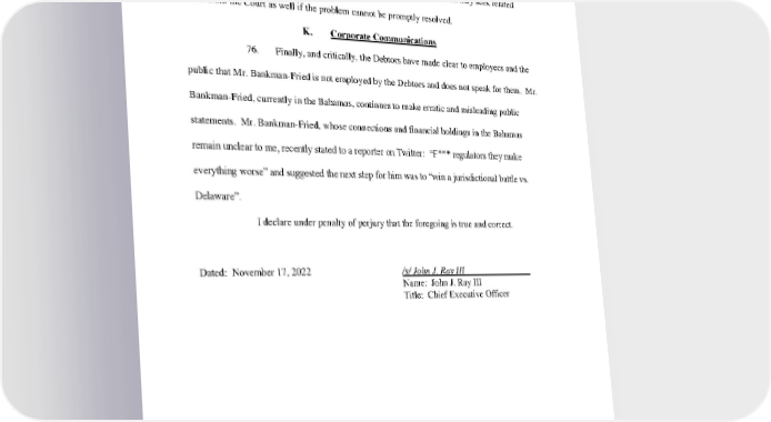 Case 22-11068-JTD Doc 24 Filed 11/17/22 Page 26 of 30 The Debtors expect to seek special relief from the Court to authorize measures to access this information as safely as possible. The Debtors are unable to create a list of their top 50 creditors that includes customers without access to the data repositories at issue, and may seek related relief from the Court as well if the problem cannot be promptly resolved. K. Corporate Communications 76. Finally, and critically, the Debtors have made clear to employees and the public that Mr. Bankman-Fried is not employed by the Debtors and does not speak for them. Mr. Bankman-Fried, currently in the Bahamas, continues to make erratic and misleading public statements. Mr. Bankman-Fried, whose connections and financial holdings in the Bahamas remain unclear to me, recently stated to a reporter on Twitter: “F*** regulators they make everything worse” and suggested the next step for him was to “win a jurisdictional battle vs. Delaware”. I declare under penalty of perjury that the foregoing is true and correct. Dated: November 17, 2022 /s/ John J. Ray III Name: John J. Ray III Title: Chief Executive Officer -26- 4892-0827-0654 v.2