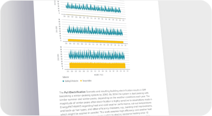 FIGURE 20 Full Electrification Scenario hourly electricity demand (excludes hydrogen electrolysis) 90 80 70 ) 60 GW ( 50 3 40 202 30 20 10 0 2005 2006 2007 2008 2009 2010 2011 2012 2013 2014 2015 2016 2017 2018 2019 2020 2021 90 80 70 ) 60 GW ( 50 4 40 203 30 20 10 0 2005 2006 2007 2008 2009 2010 2011 2012 2013 2014 2015 2016 2017 2018 2019 2020 2021 90 80 70 ) 60 GW ( 50 050 40 2 30 20 10 0 2005 2006 2007 2008 2009 2010 2011 2012 2013 2014 2015 2016 2017 2018 2019 2020 2021 Subsector WEATHER (YEAR) Building & Productive Transportation The Full Electrification Scenario and resulting building electrification results in SPP becoming a winter-peaking system by 2050. By 2034 the system is dual peaking with similar summer and winter peaks, depending on the weather conditions each year. The magnitude of winter peaks after electrification is highly sensitive to assumptions made in EnergyPATHWAYS regarding heat and cold weather performance, cut-out temperatures and back-up fuel types, and other efÏciency measures, e.g., building shell improvements, which might be applied in parallel. This work assumes high efÏciency cold weather heat pumps are sold and that such systems switch to electric resistance heating once -13 degrees Fahrenheit is reached. This matches the highest performance systems sold in the U.S. today8 8 Example system: https://www.mitsubishicomfort.com/articles/mythbusters-heat-pumps-for-extreme-cold-climates SPP FUTURE LOAD SCENARIOS | EVOLVED ENERGY RESEARCH | 27