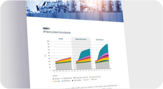 FIGURE 17 SPP Electricity Demand by Key Subsector Baseline Moderate Electrification Full Electrification 1,000 900 800 700 600 h 500 TW 400 300 200 100 0 2000 2025 2030 2035 2040 2045 2050 2000 2025 2030 2035 2040 2045 2050 2000 2025 2030 2035 2040 2045 2050 Subsector Electrolysis Light Duty Vehicles Medium & Heavy-Duty Trucks Space & Water Heating Data Center Bulk Chemicals Oil & Gas Mining Agriculture Other Loads The on-road vehicle stocks within SPP’s service territory that result in the demonstrated increases in electricity consumption are shown in Figure 18. Within SPP’s service territory, 32% of vehicle stock is electrified by 2050, but 50% of vehicle stock nationally based on the state-differentiated adoption rates. Higher rates of electrification of medium-duty vehicles are the result of better economics for high mileage vehicles and predictable duty cycles that create a compelling case for electrification. SPP FUTURE LOAD SCENARIOS | EVOLVED ENERGY RESEARCH | 24