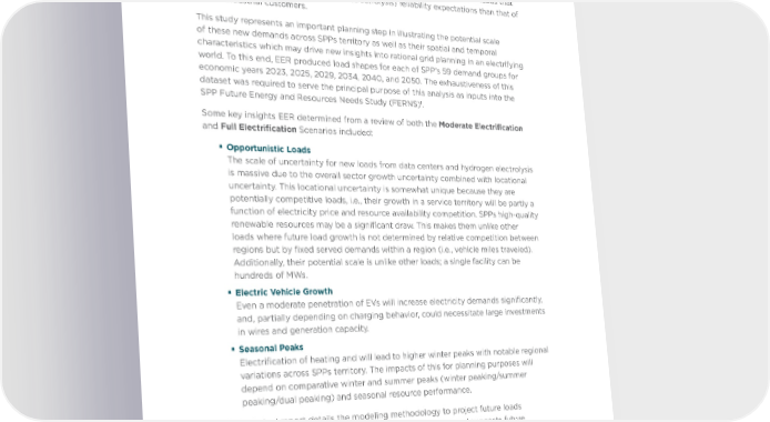 flexible loads, can reduce new infrastructure needs. Electrification of space heating may represent a relatively small share of annual electricity demand but contribute towards changing peaks from summer to winter. Finally, new data center and electrolysis loads have the potential to further increase loads in SPP’s service territory and are loads that may have higher (data center) or lower (electrolysis) reliability expectations than that of typical industrial customers. This study represents an important planning step in illustrating the potential scale of these new demands across SPPs territory as well as their spatial and temporal characteristics which may drive new insights into rational grid planning in an electrifying world. To this end, EER produced load shapes for each of SPP’s 59 demand groups for economic years 2023, 2025, 2029, 2034, 2040, and 2050. The exhaustiveness of this dataset was required to serve the principal purpose of this analysis as inputs into the 1 SPP Future Energy and Resources Needs Study (FERNS). Some key insights EER determined from a review of both the Moderate Electrification and Full Electrification Scenarios included: ƒ Opportunistic Loads The scale of uncertainty for new loads from data centers and hydrogen electrolysis is massive due to the overall sector growth uncertainty combined with locational uncertainty. This locational uncertainty is somewhat unique because they are potentially competitive loads, i.e., their growth in a service territory will be partly a function of electricity price and resource availability competition. SPPs high-quality renewable resources may be a significant draw. This makes them unlike other loads where future load growth is not determined by relative competition between regions but by fixed served demands within a region (i.e., vehicle miles traveled). Additionally, their potential scale is unlike other loads; a single facility can be hundreds of MWs. ƒ Electric Vehicle Growth Even a moderate penetration of EVs will increase electricity demands significantly, and, partially depending on charging behavior, could necessitate large investments in wires and generation capacity. ƒ Seasonal Peaks Electrification of heating and will lead to higher winter peaks with notable regional variations across SPPs territory. The impacts of this for planning purposes will depend on comparative winter and summer peaks (winter peaking/summer peaking/dual peaking) and seasonal resource performance. This technical report details the modeling methodology to project future loads Scenarios, discusses the results of these Scenario analyses, and suggests future areas of study to address the uncertainties of renewable energy integration and load management in these new electricity load growth paradigms. 1 Brattle Group. “SPP Future Energy and Resource Needs Study (FERNS): Capacity Expansion Modeling Approach, Feb. 2024. SPP FUTURE LOAD SCENARIOS | EVOLVED ENERGY RESEARCH | 4