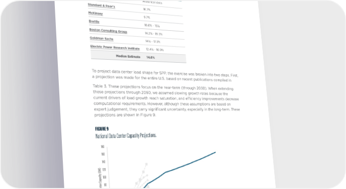 TABLE 3 Compiled Sources for Data Center Load Growth Source & Link Growth Rate (2024-2030) Baxtel Historical data Standard & Poor’s 16.7% McKinsey 9.7% Brattle 10.6% - 15% Boston Consulting Group 14.2% - 19.3% Goldman Sachs 14% - 17.3% Electric Power Research Institute 12.4% - 16.9% Median Estimate 14.6% To project data center load shape for SPP, the exercise was broken into two steps. First, a projection was made for the entire U.S. based on recent publications compiled in Table 3. These projections focus on the near-term (through 2030). When extending these projections through 2050, we assumed slowing growth rates because the current drivers of load growth reach saturation, and efÏciency improvements decrease computational requirements. However, although these assumptions are based on expert judgement, they carry significant uncertainty, especially in the long-term. These projections are shown in Figure 9. FIGURE 9 National Data Center Capacity Projections. Note. The grey lines represent different estimates from literature; the blue line represents the median estimate compiled by EER and extrapolated through 2050. SPP FUTURE LOAD SCENARIOS | EVOLVED ENERGY RESEARCH | 16