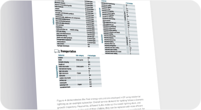 FIGURE 3 EnergyPATHWAYS Economic Subsectors Figure 4 demonstrates the final energy calculations employed in EP using residential lighting as an example subsector. Overall service demand for lighting follows a Scenario growth trajectory. Meanwhile, different bulbs make up the overall lighting stock, and as those bulbs reach the end of their lifetime, they can be replaced with more efĂcient lightbulb technologies. Here, LEDs replace existing stocks of CFLs and incandescent, for example. SPP FUTURE LOAD SCENARIOS | EVOLVED ENERGY RESEARCH | 9