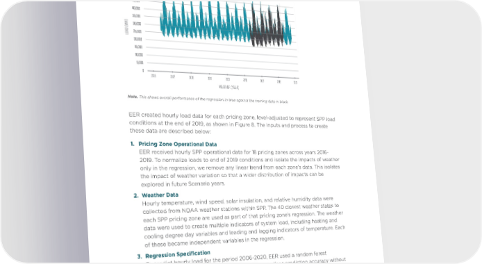 FIGURE 8 Total SPP Load Regression Training and Output Data, Normalized to End of 2019 55,000 50,000 45,000 40,000 35,000 ) W30,000 M ( D A25,000 O L 20,000 15,000 10,000 5,000 0 2005 2007 2009 2011 2013 2015 2017 2019 2021 WEATHER (YEAR) Note. This shows overall performance of the regression in blue against the training data in black. EER created hourly load data for each pricing zone, level-adjusted to represent SPP load conditions at the end of 2019, as shown in Figure 8. The inputs and process to create these data are described below: 1. Pricing Zone Operational Data EER received hourly SPP operational data for 18 pricing zones across years 2016- 2019. To normalize loads to end of 2019 conditions and isolate the impacts of weather only in the regression, we remove any linear trend from each zone’s data. This isolates the impact of weather variation so that a wider distribution of impacts can be explored in future Scenario years. 2. Weather Data Hourly temperature, wind speed, solar insulation, and relative humidity data were collected from NOAA weather stations within SPP. The 40 closest weather states to each SPP pricing zone are used as part of that pricing zone’s regression. The weather data were used to create multiple indicators of system load, including heating and cooling degree day variables and leading and lagging indicators of temperature. Each of these became independent variables in the regression. 3. Regression Specification To predict hourly load for the period 2006-2020, EER used a random forest regression. Random forest regression provides excellent prediction accuracy without overfitting, which can occur with other machine learning algorithms such as neural networks. The “trees” created within random forest regressions allow for unique interactions between variables, which improve overall fit because electricity demand often depends on complex interactions of weather conditions. SPP FUTURE LOAD SCENARIOS | EVOLVED ENERGY RESEARCH | 13