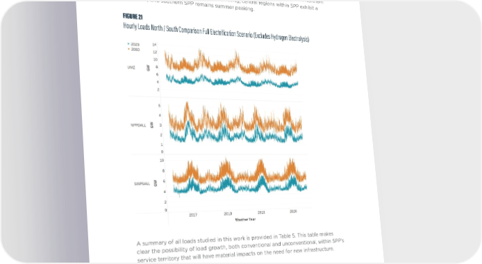 The impact of building heating electrification on SPP load shapes is highly dependent on location within SPP and the coldest temperatures regularly encountered. Figure 21 illustrates this point for the Full Electrification Scenario using pricing zones in the northern (UMZ), central (NPPDALL), and southern (SWPSALL) regions of SPP. Northern climes within SPP become highly winter peaking; central regions within SPP exhibit a dual peak; and southern SPP remains summer peaking. FIGURE 21 Hourly Loads North / South Comparison Full Electrification Scenario (Excludes Hydrogen Electrolysis) A summary of all loads studied in this work is provided in Table 5. This table makes clear the possibility of load growth, both conventional and unconventional, within SPP’s service territory that will have material impacts on the need for new infrastructure. SPP FUTURE LOAD SCENARIOS | EVOLVED ENERGY RESEARCH | 28