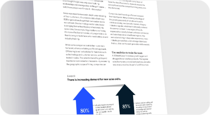 At some B2B companies, especially in the access fresh pools of talent, enable global growth technology sector, these skills are becoming strategies, and even tactically improve their reach standard (Exhibit 8). An executive at a large through such basic measures as being in the technology firm explained, “Our salespeople need same time zone as potential customers. One B2B to be able to understand data. They need to be able company is experimenting with offshoring its sales- to look at situations or customers intuitively and development reps, starting with a small team of see patterns. If I had more traditional salespeople fewer than ten. If successful, it plans to expand the who thought the job was only about building concept to relieve the competitive hiring pressure in relationships and closing a deal on the golf course… the US market. well, those people won't make it in this market.” Companies don’t have to go offshore to expand Since reps need to have an in-depth understanding their talent pools. Many are taking advantage of of their customers, it’s understandable that many the growing popularity of remote work and its B2B organizations target their own customers for role in accessing new domestic markets. A legacy recruitment. One technology-sector sales leader industrial supplier, which had traditionally centered is bringing former healthcare professionals into its commercial team in one region of the US, sales roles, for example. Organizations are finding expanded to diversify its team; with new commercial it’s more effective to train industry experts in sales and sales leads in non-traditional regions, they than to bring in fresh faces who need both sales and were able to bring in deep sales experience, cross- industry training. industry perspectives, and a stronger talent pool that could deliver the next-generation skills needed. While some companies look to their customers for talent, others are taking a different approach. Offshoring is well established for functions such Use analytics to train the team as technology and customer service, but less A US health payor’s revenue growth lagged as it tested in sales. The potential benefits go beyond struggled to sell ancillary products. The regional traditional cost-reduction measures—by expanding sales teams rarely shared best practices, and sales the geographic scope of hiring, companies can was broadly reactive. As part of a shift to a more Web 2022 Emerging cautiously: Australian Consumers in 2022 Exhibit 8 Exhibit 2 of 10 There is increasing demand for new sales skills. of sales leaders surveyed believe solution selling will ranked analytical and 85% be a core sales capability, 80% quantitative skills among requiring strong product the top capabilities to knowledge and solution develop. design as well as account-planning skills. Analytical and quantitative skills Solution selling McKinsey & Company 28 Future of B2B sales: The big reframe