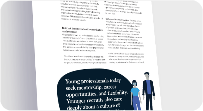 its training to sellers’ individual needs, it saw a that is not the perfect fit for a customer, damaging 4 percent rise in revenue. longer-term prospects for that relationship. Meeting targets is challenging—especially in times of Sales leaders can use data in this way to identify economic uncertainty—and, as reps strive to meet gaps in sellers’ knowledge and skills, understand them from one quarter to the next, they might have how reps can apply their learning to active sales little interest in long-term account management. opportunities, and replicate the best practices Or they might move off if they get a better deal of top performers. By using commercial-activity elsewhere. However, as the skills and mindsets of analytics to assess how reps spend their time, reps evolve, more personal motivations to drive measuring digital interactions (such as emails retention and focus on longer-term objectives could and appointments) and linking them with existing be a solution. organizational data, business contexts can be assessed. This too can inform which training should Go beyond financial incentives. The most recent be aimed at which individuals. recruits to the workforce, Generation Z, care about the principles and culture of their place of work: 42 percent care more about their company’s 12 Rethink incentives to drive motivation values and purpose than salary levels. Young and retention professionals today seek mentorship, career Organizations typically motivate sales reps by using opportunities, and flexibility. The desire to decide monthly or quarterly financial incentives to ensure when, where, and how they work has been revenue targets are met and to retain staff. Over reinforced by the pandemic, and available options time, however, companies have seen downsides to have increased. Younger recruits also care deeply this approach, exacerbated by changing customer about a culture of diversity and free thinking. behavior and redefined sales-rep skills. Analysis shows that a lack of career path is a major Short-term incentives can even lead to decisions driver of voluntary attrition. Most companies have that hurt long-term opportunities. To meet monthly a two-year plan for a sales career path, often targets, for example, a sales rep might sell a product causing reps to leave after that amount of time. A Young professionals today seek mentorship, career opportunities, and flexibility. Younger recruits also care deeply about a culture of diversity and free thinking. 12 Hillary Hoffower, “Money isn’t everything for the 20 percent of people who regret quitting their jobs during the Great Resignation,” Business Insider, April 19, 2022. Future of B2B sales: The big reframe 31