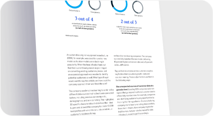 Web 2022 Emerging cautiously: Australian Consumers in 2022 Exhibit 2 Exhibit 2 of 10 Outperformers are already using analytics extensively. Outperformers Slow growers Outperformers Slow growers 3 out of 4 2 out of 3 outperformers apply tables-stakes outperformers apply analytics use cases analytics such as sales planning to be more granular on deal and (vs half of slow growers) account-level opportunities (vs half of slow growers) McKinsey & Company An automotive original-equipment manufacturer we heard across leading companies. The company (OEM), for example, was about to launch a new successfully launched the new model, delivering model as its older models were declining in 10 percent higher conversion rates and a 5 percent popularity. When the head of sales found out sales uplift overall. that their current lead generation plan hinged on converting existing customers, he realized Top performers emphasize two customer analytics an expanded approach was needed to identify key factors that can unlock growth—data and potential customers as well. What type of buyer decision making. These outperformers use them in would want to buy this vehicle, and how could the the following ways: company approach them and finish the sale? Use unexpected sources of customer data at a The company used machine learning to combine five granular level. Leading B2B companies build rich different data sources that had not been connected signals that go beyond traditional customer data to before, including previous ownership data, offer a fully rounded view. For example, companies demographics, and service history. This highlighted are identifying customer buying opportunities by 30 specific characteristics that defined their ideal tracking their hiring patterns—if a manufacturing buyers and allowed the company to create 10,000 company starts heavily recruiting data scientists, lead profiles with which to calculate an individual then a tech infrastructure company might infer customer’s readiness to buy. that the manufacturer is in the market for data infrastructure and target it accordingly. Their experience of leveraging granular internal data to determine propensity to buy is a common theme 8 Future of B2B sales: The big reframe