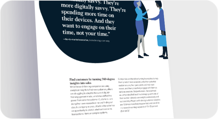“Today’s buyers are more technically savvy. They're more digitally savvy. They're spending more time on their devices. And they want to engage on their time, not your time.” —Go-to-market executive, biotechnology company Find customers by turning 360-degree Companies are therefore turning to analytics to help insights into sales them predict more accurately who their potential While forward-thinking companies are using customers are, their pain points and their next analytical insights to find new customers, others moves, and then proactively engage with them as are struggling to adapt to the current digital- early as possible. Outperformers—here defined first engagement model, which has shifted the as companies that beat the average growth rate of power from seller to customer. Customers—are their sector—already use analytics extensively and doing their own research online and finding out successfully. Players with strong customer analytics about a company or product before the seller has are 1.5 times more likely to grow fast, and can drive an opportunity to pitch it, whether it concerns increases in earnings upwards of 15–25 percent 1 transactional items or complex systems. (Exhibit 2). 1 Jochen Böringer, Alexander Dierks, Isabel Huber, and Dennis Spillecke, “Insights to impact: Creating and sustaining data-driven commercial growth,” McKinsey, January 18, 2022. Future of B2B sales: The big reframe 7